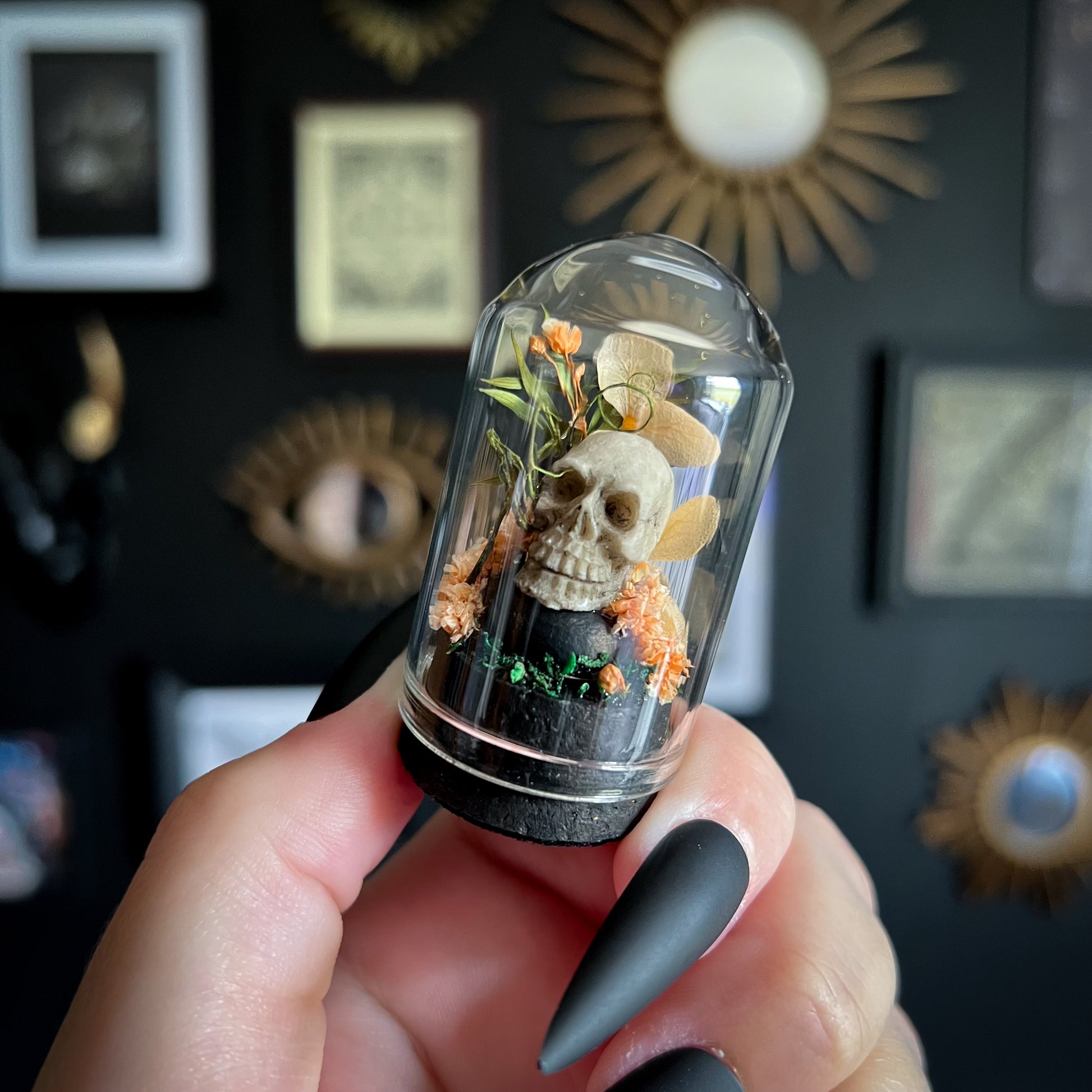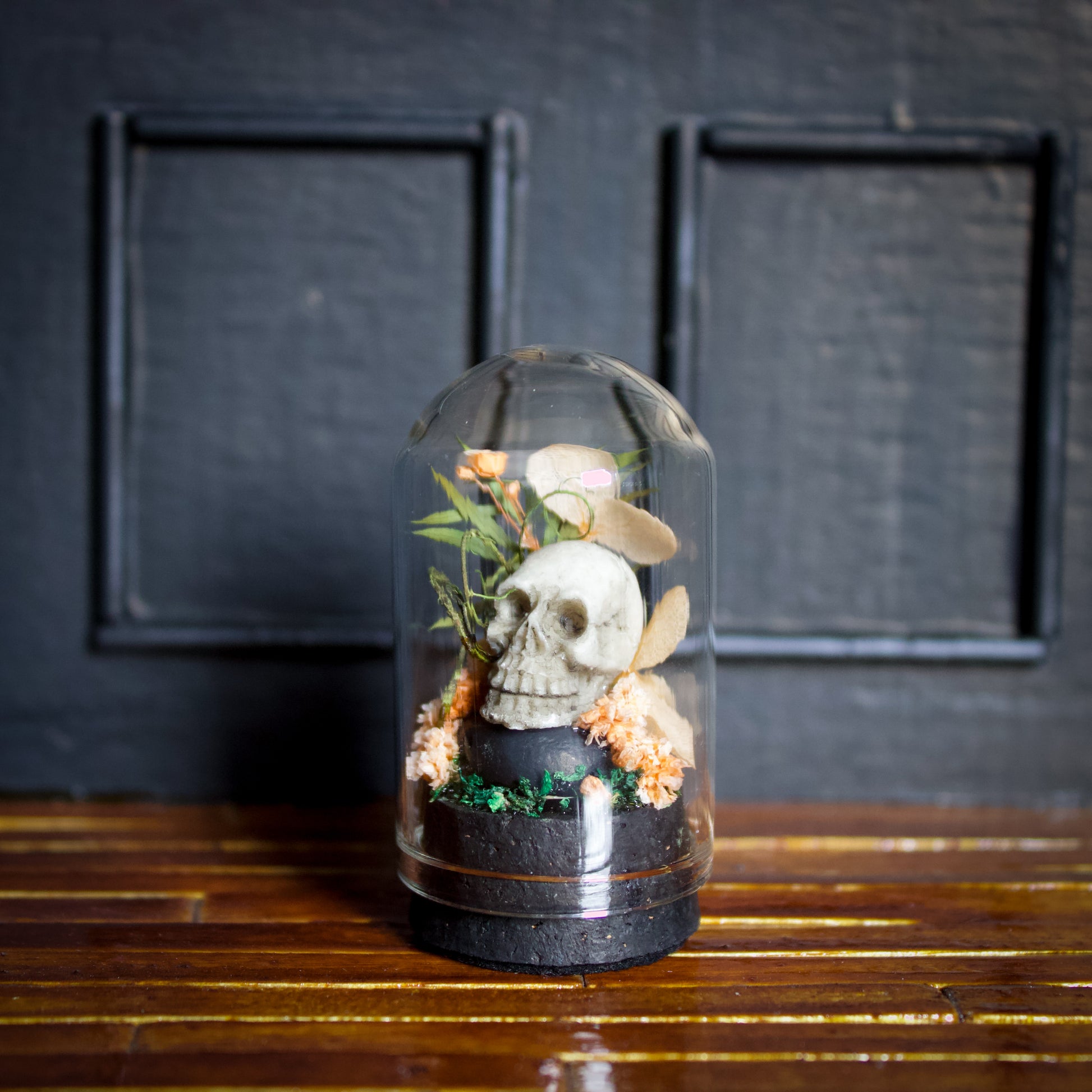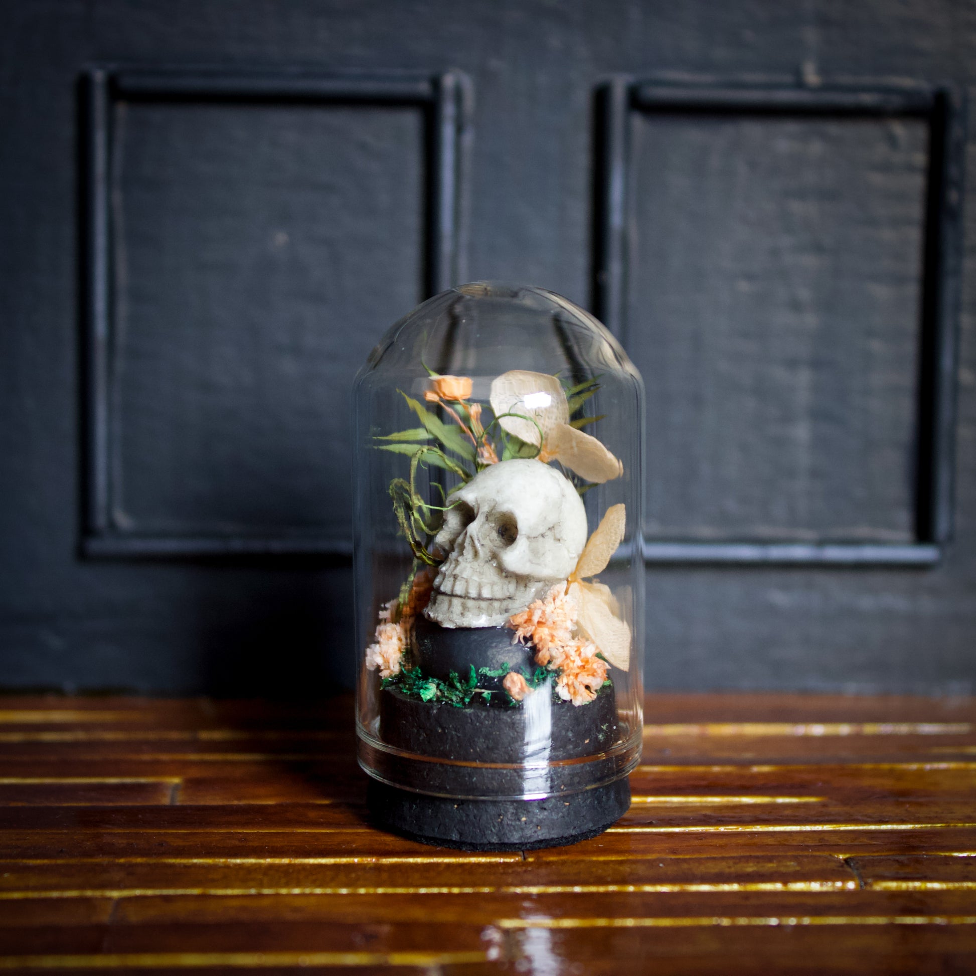 Add a touch of dark enchantment to your space with our handmade curio domes - miniature worlds captured under glass. Each dome is carefully assembled with an eerie mix of curiosities; clay skulls, faux insects & bones, real dried florals & moss, crystals and other haunted treasures.