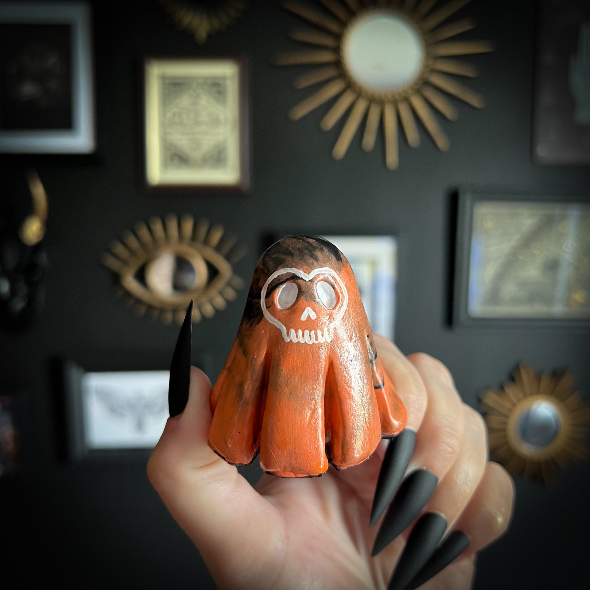 Each concrete ghost in our collection is a one-of-a-kind creation, individually hand poured with care and character. Some remain unpainted, while others are adorned with hand-painted details that make them truly unique. Whether spooky or sweet, these one-off little ghouls add the perfect touch of haunted charm to any shelf, altar or darkly whimsical space.