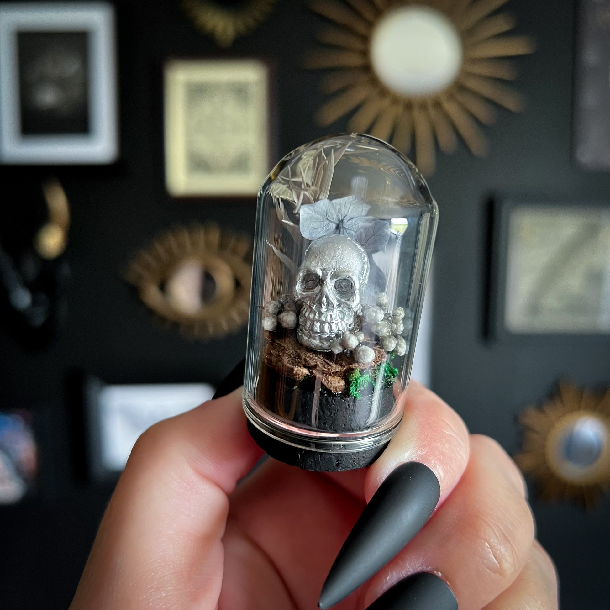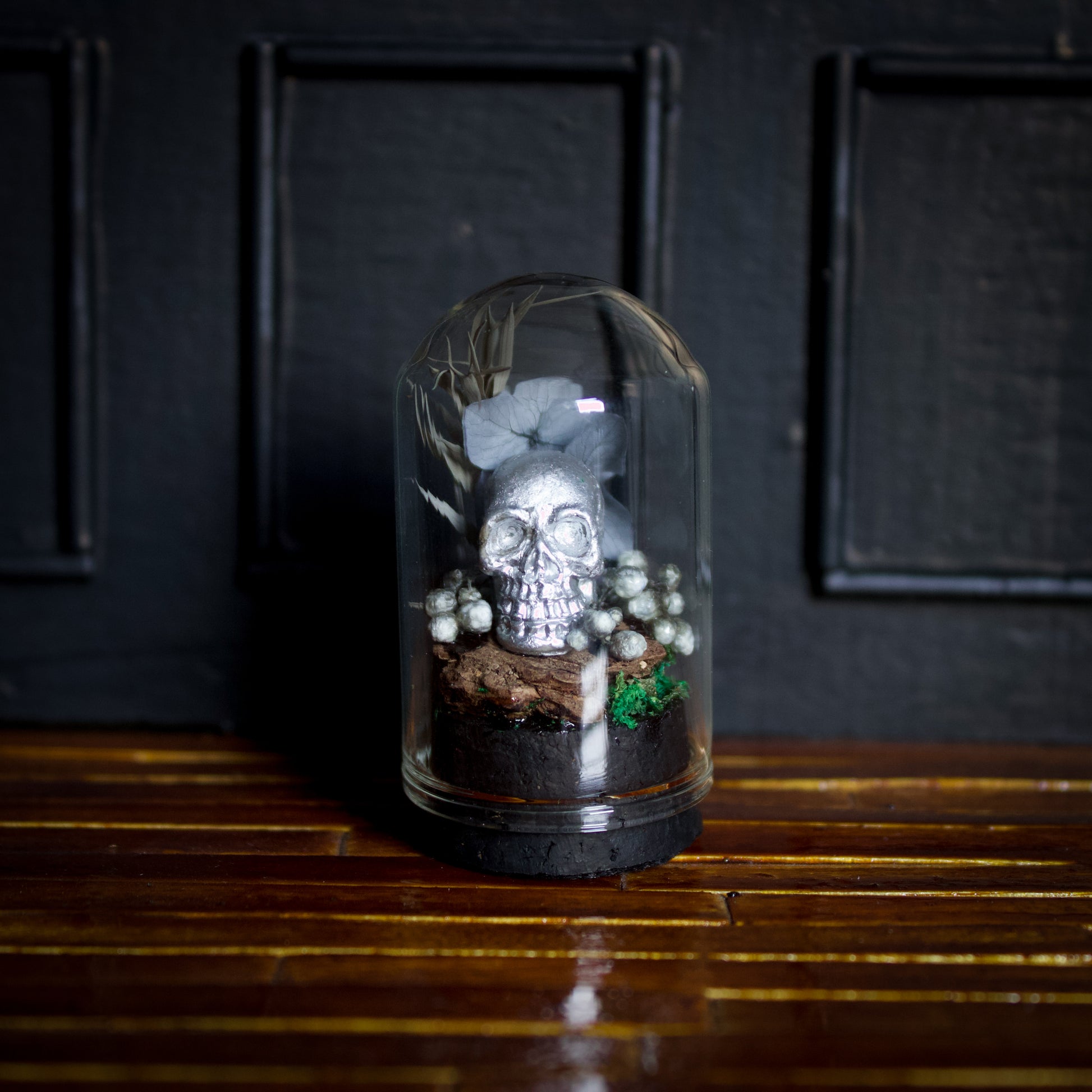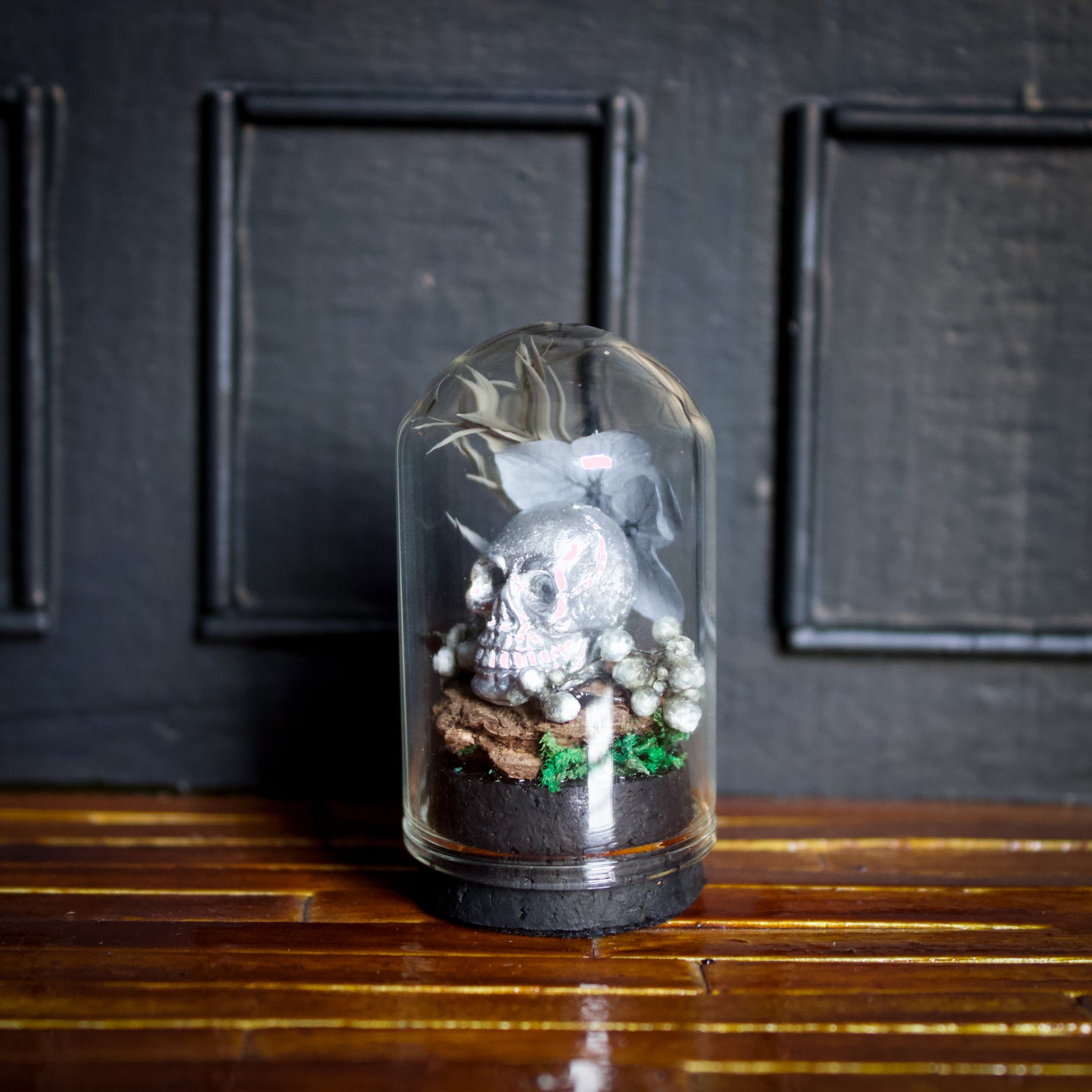 Add a touch of dark enchantment to your space with our handmade curio domes - miniature worlds captured under glass. Each dome is carefully assembled with an eerie mix of curiosities; clay skulls, faux insects & bones, real dried florals & moss, crystals and other haunted treasures.