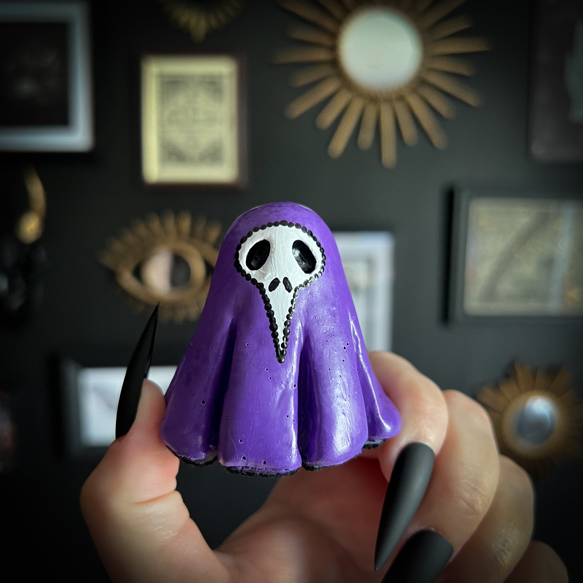 Each concrete ghost in our collection is a one-of-a-kind creation, individually hand poured with care and character. Some remain unpainted, while others are adorned with hand-painted details that make them truly unique. Whether spooky or sweet, these one-off little ghouls add the perfect touch of haunted charm to any shelf, altar or darkly whimsical space.