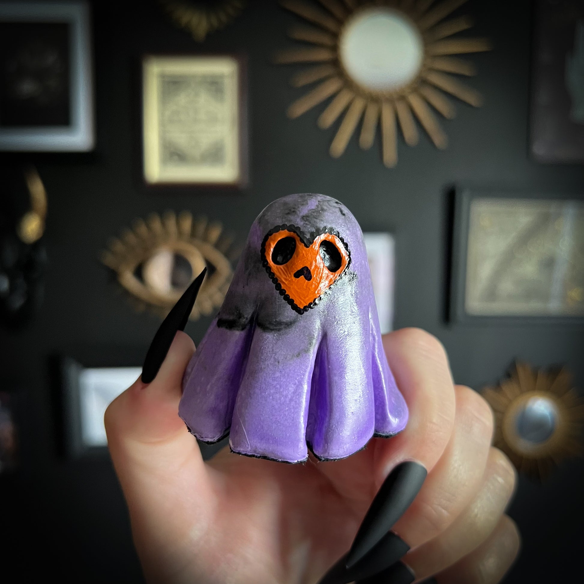 Each concrete ghost in our collection is a one-of-a-kind creation, individually hand poured with care and character. Some remain unpainted, while others are adorned with hand-painted details that make them truly unique. Whether spooky or sweet, these one-off little ghouls add the perfect touch of haunted charm to any shelf, altar or darkly whimsical space.