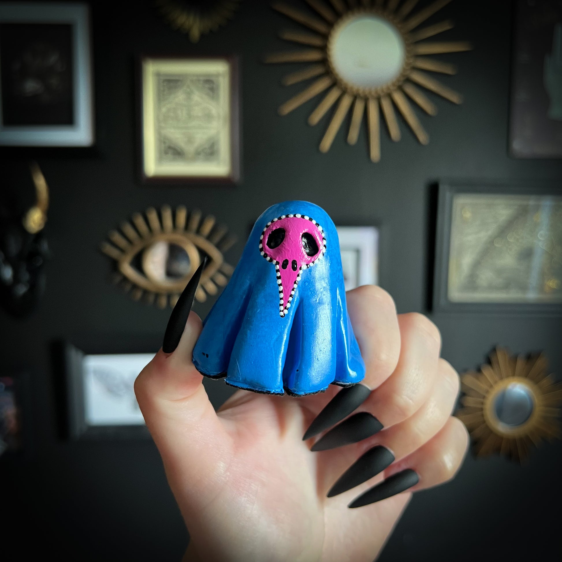 Each concrete ghost in our collection is a one-of-a-kind creation, individually hand poured with care and character. Some remain unpainted, while others are adorned with hand-painted details that make them truly unique. Whether spooky or sweet, these one-off little ghouls add the perfect touch of haunted charm to any shelf, altar or darkly whimsical space.