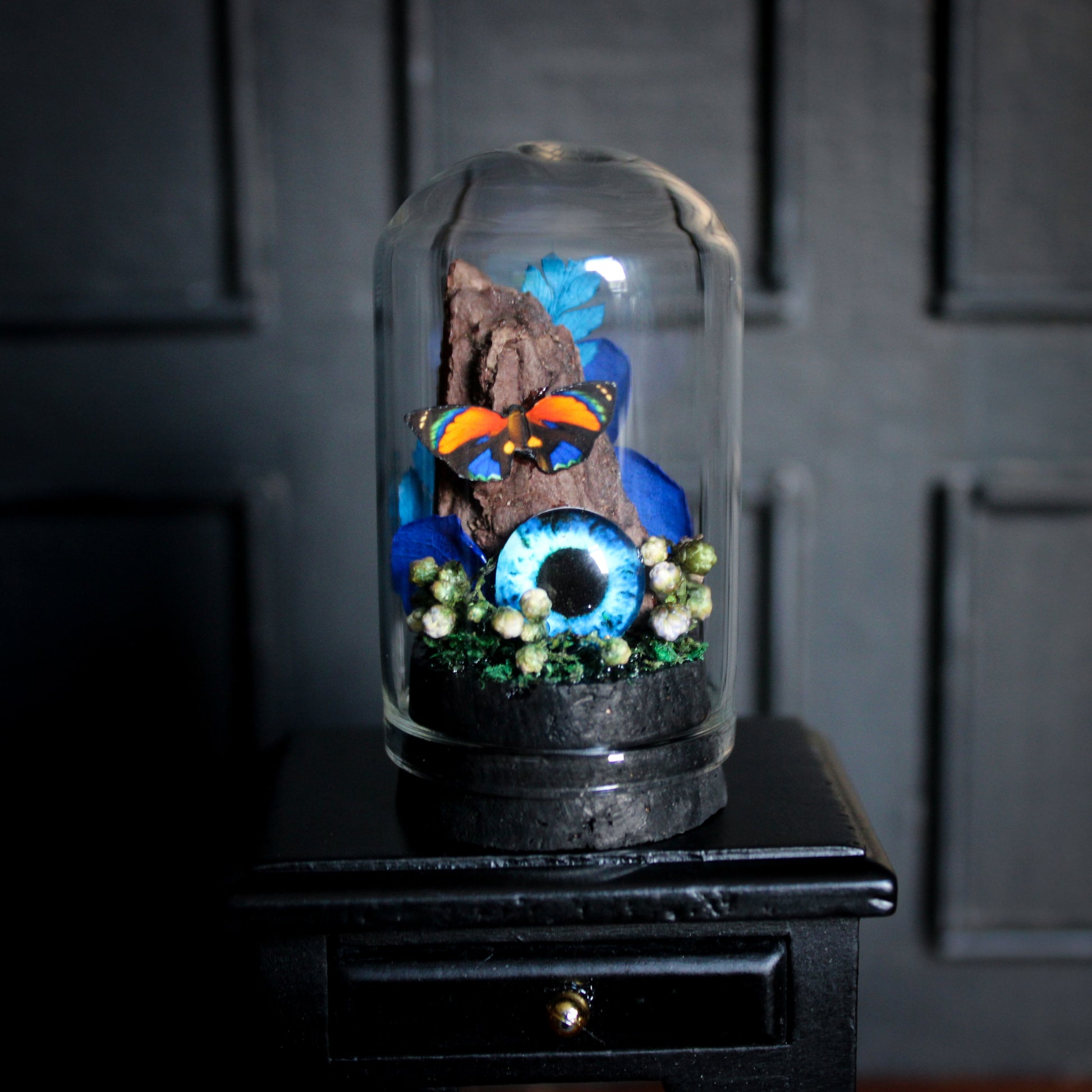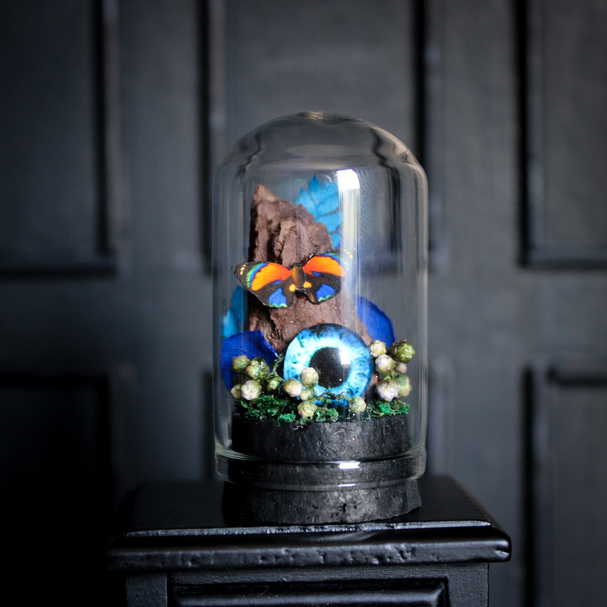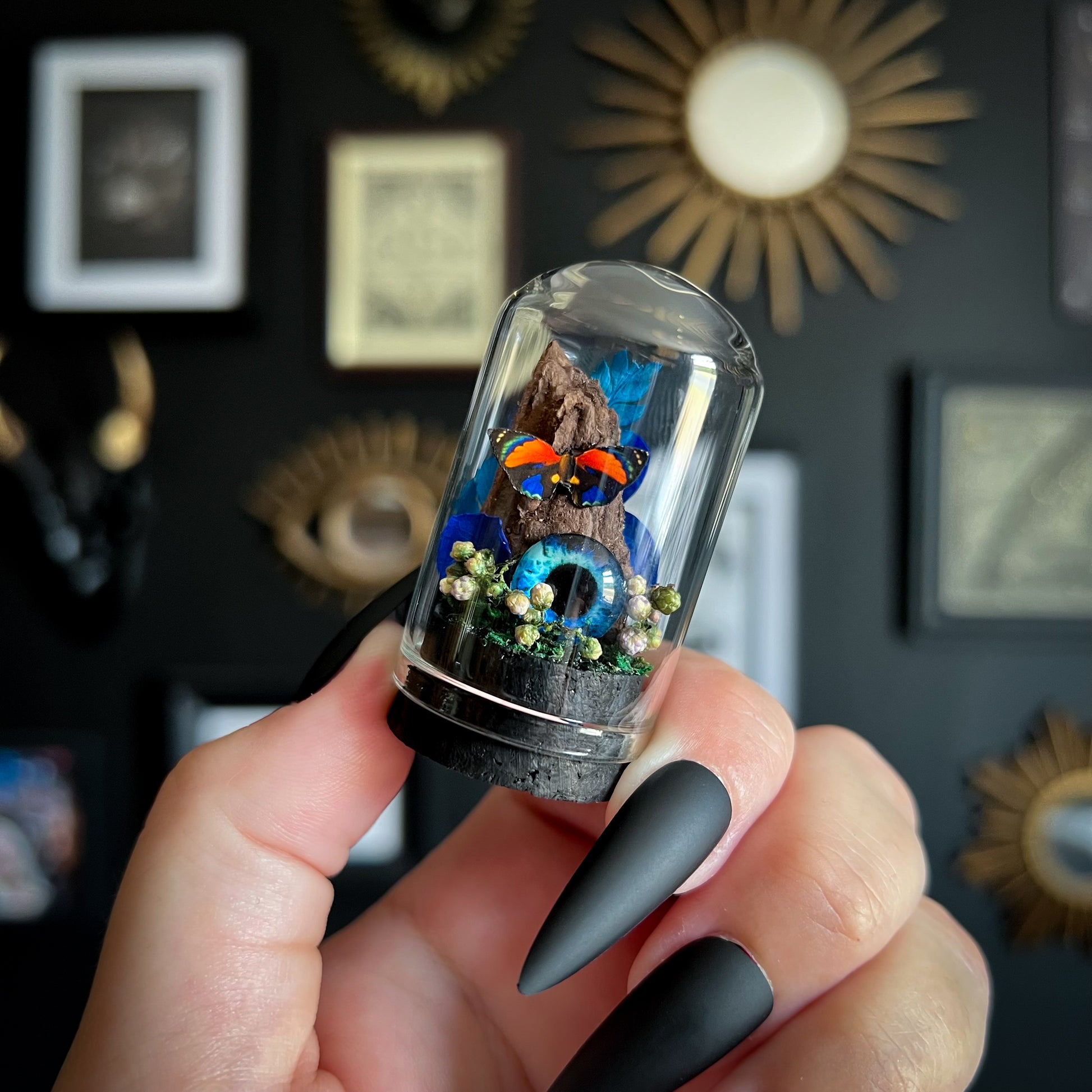Add a touch of dark enchantment to your space with our handmade curio domes - miniature worlds captured under glass. Each dome is carefully assembled with an eerie mix of curiosities; clay skulls, faux insects & bones, real dried florals & moss, crystals and other haunted treasures.