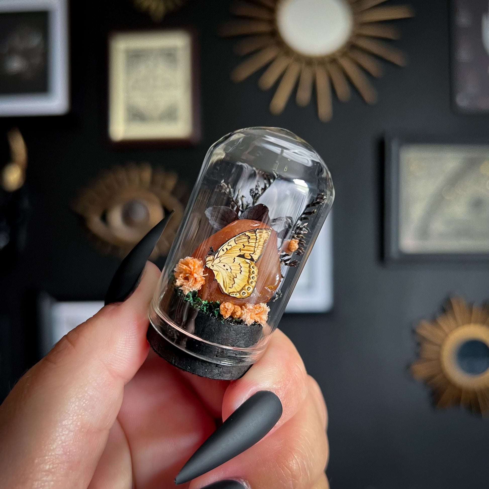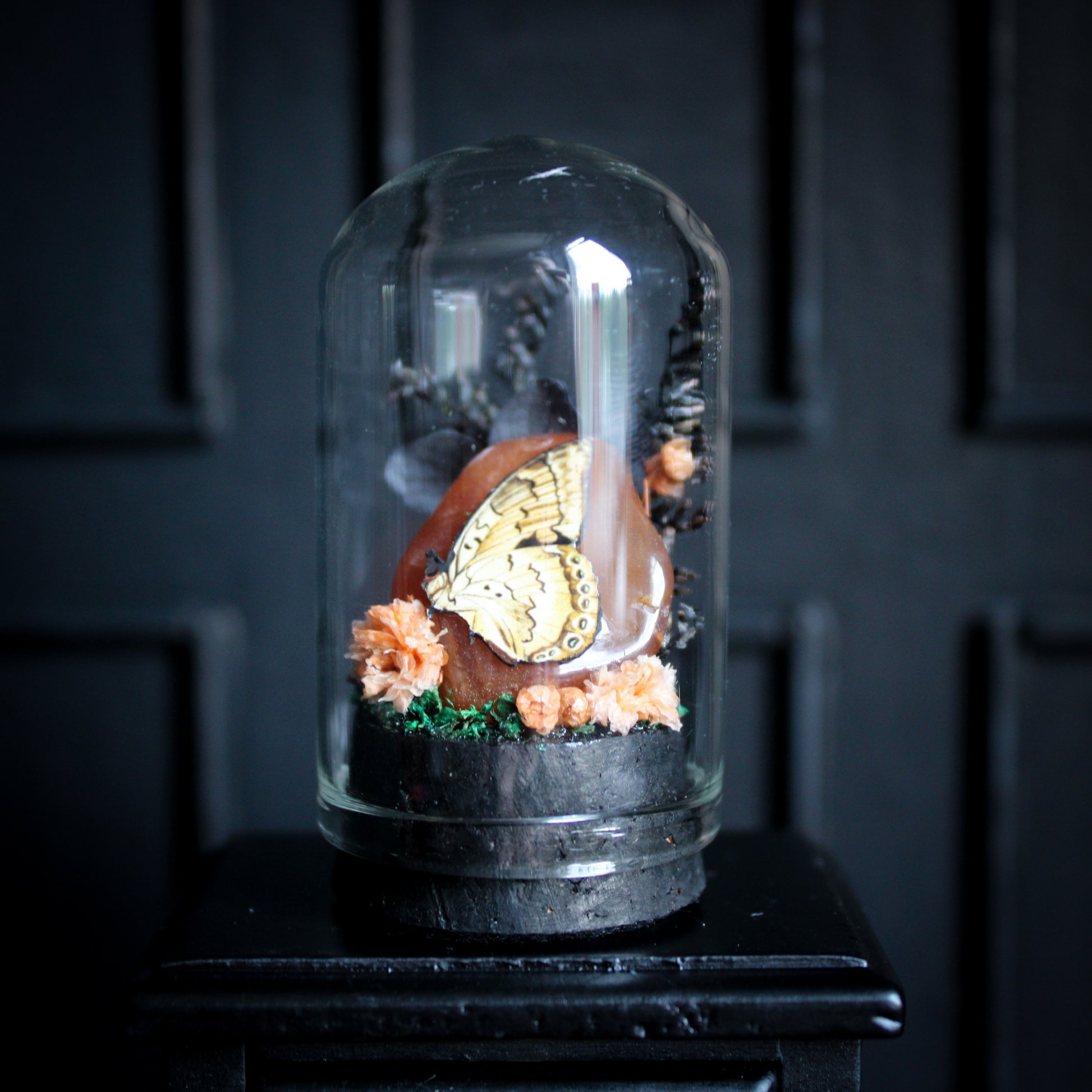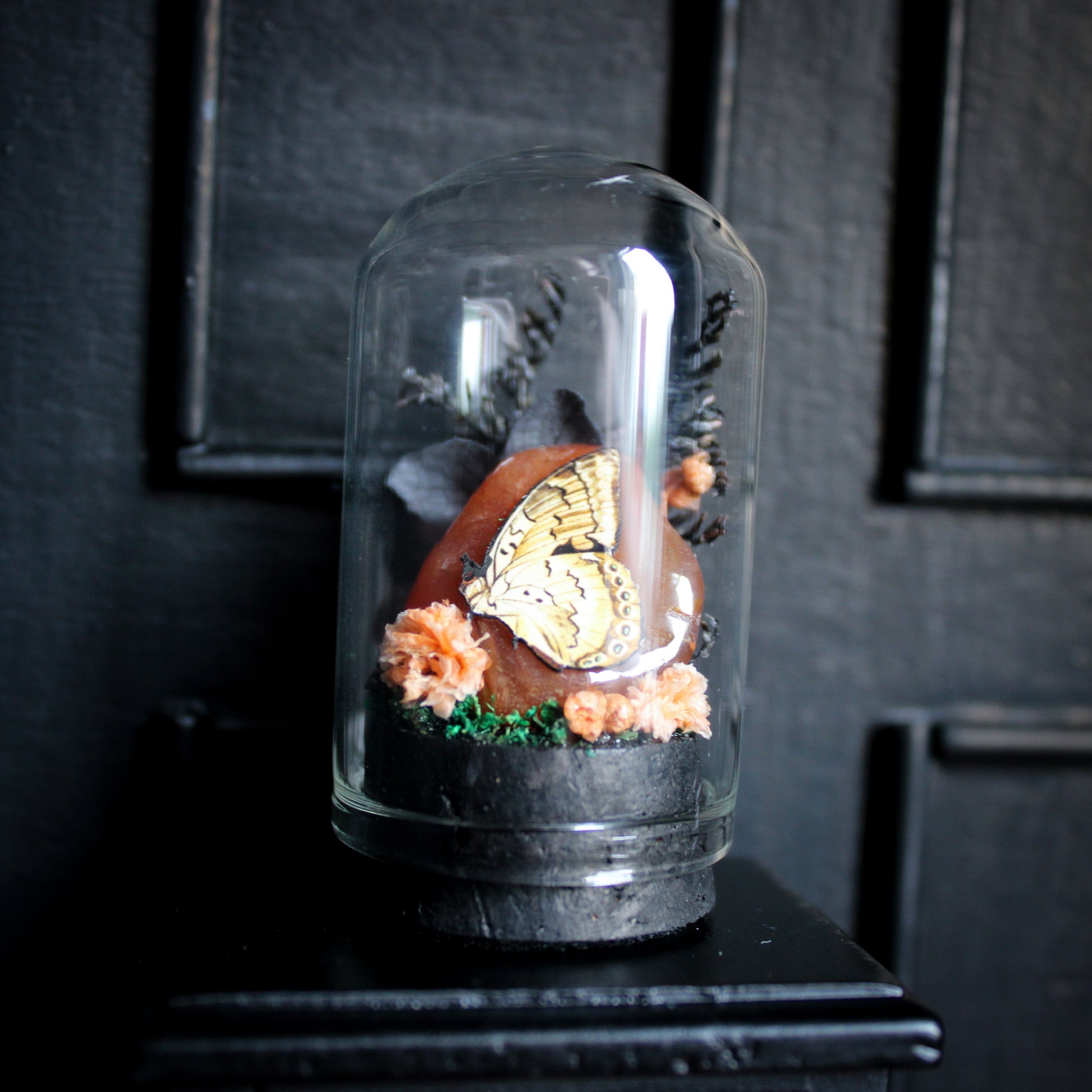 Add a touch of dark enchantment to your space with our handmade curio domes - miniature worlds captured under glass. Each dome is carefully assembled with an eerie mix of curiosities; clay skulls, faux insects & bones, real dried florals & moss, crystals and other haunted treasures.
