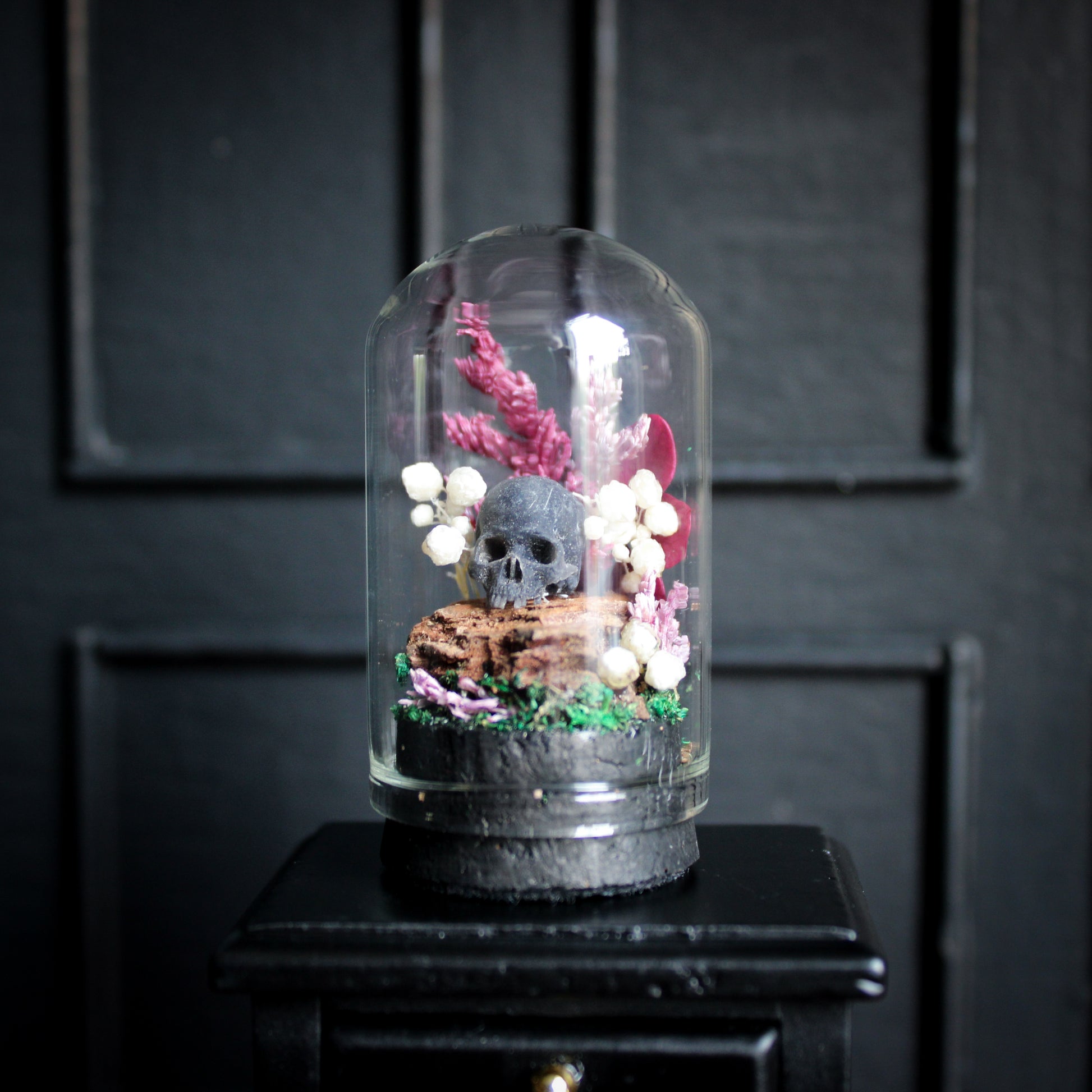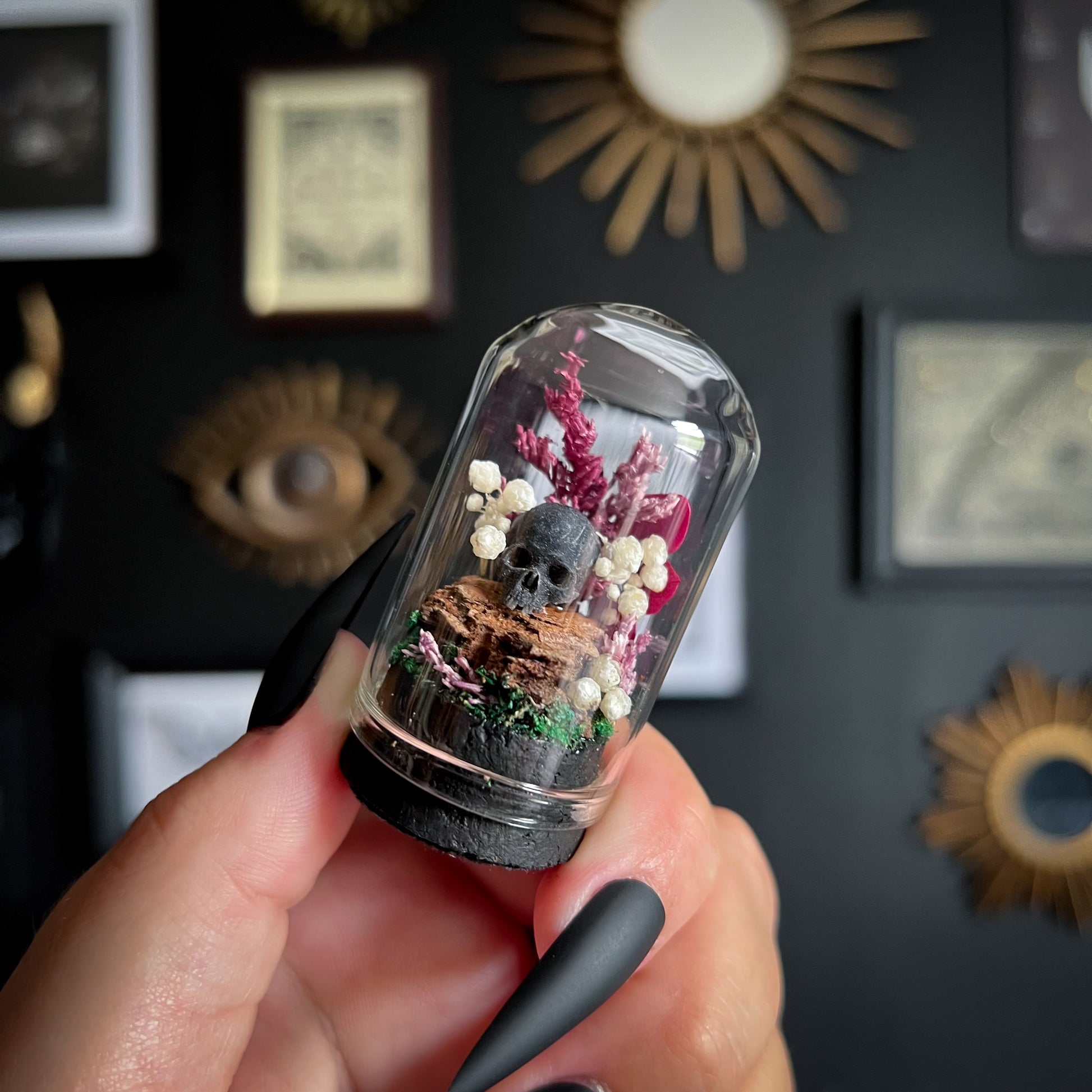 Add a touch of dark enchantment to your space with our handmade curio domes - miniature worlds captured under glass. Each dome is carefully assembled with an eerie mix of curiosities; clay skulls, faux insects & bones, real dried florals & moss, crystals and other haunted treasures.