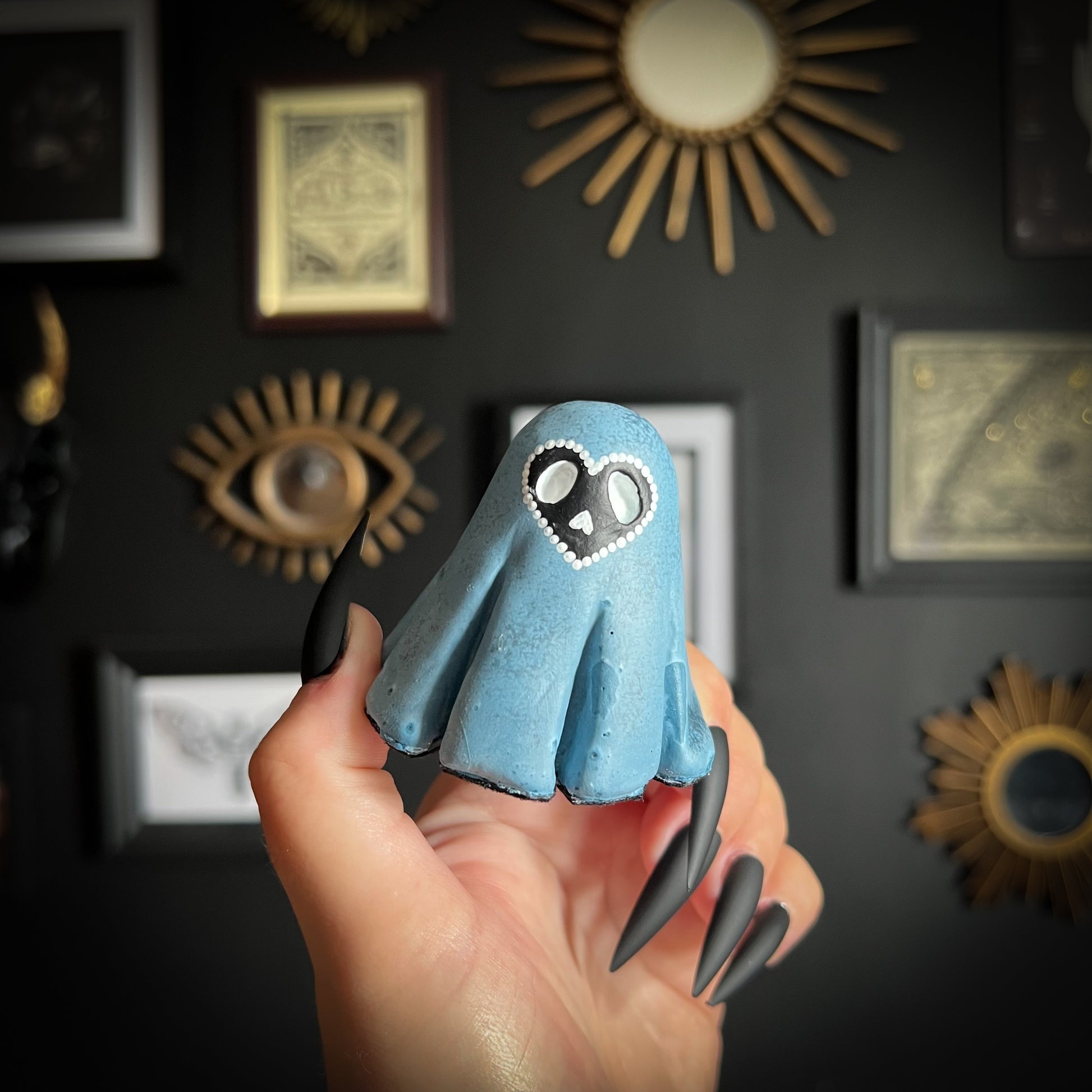 Each concrete ghost in our collection is a one-of-a-kind creation, individually hand poured with care and character. Some remain unpainted, while others are adorned with hand-painted details that make them truly unique. Whether spooky or sweet, these one-off little ghouls add the perfect touch of haunted charm to any shelf, altar or darkly whimsical space.