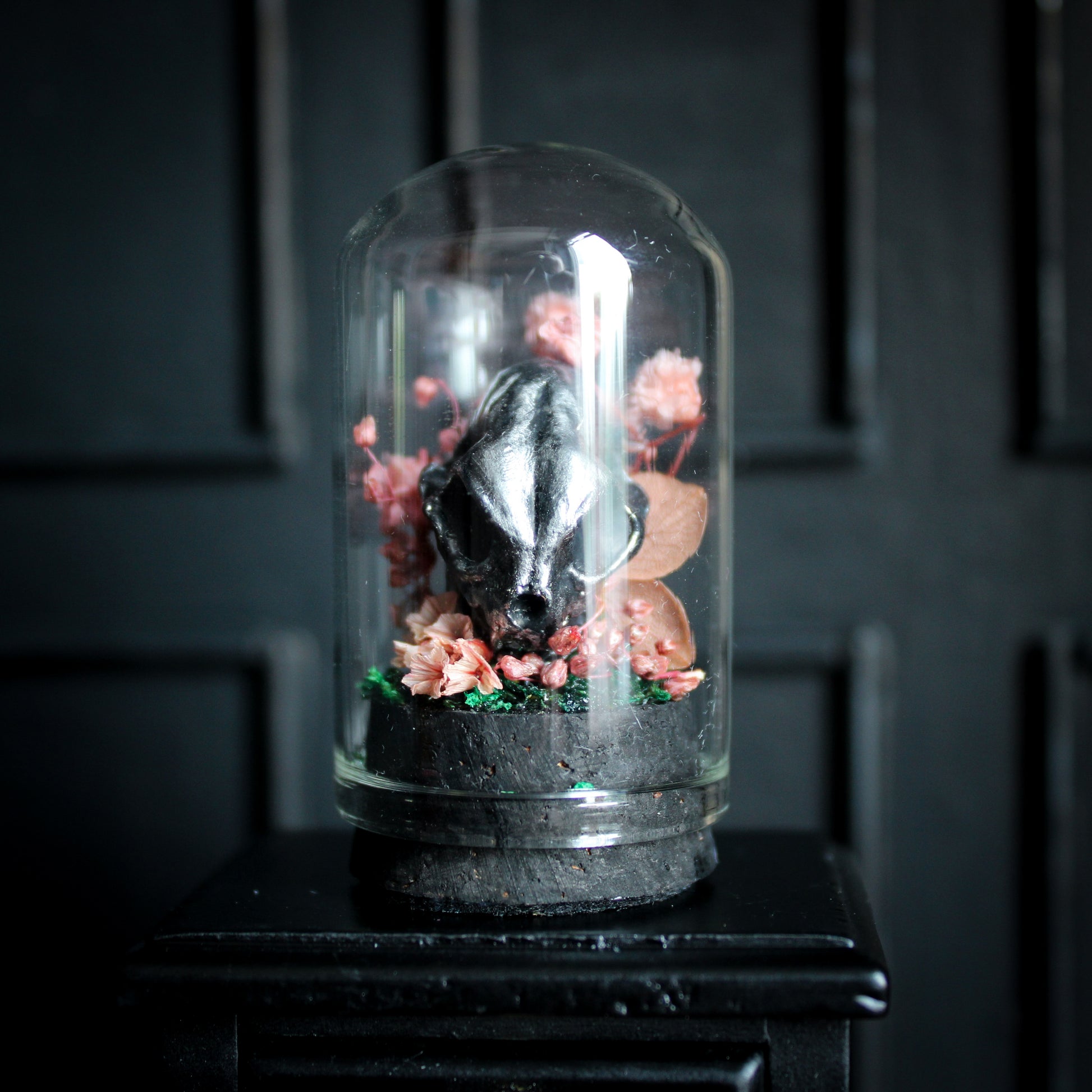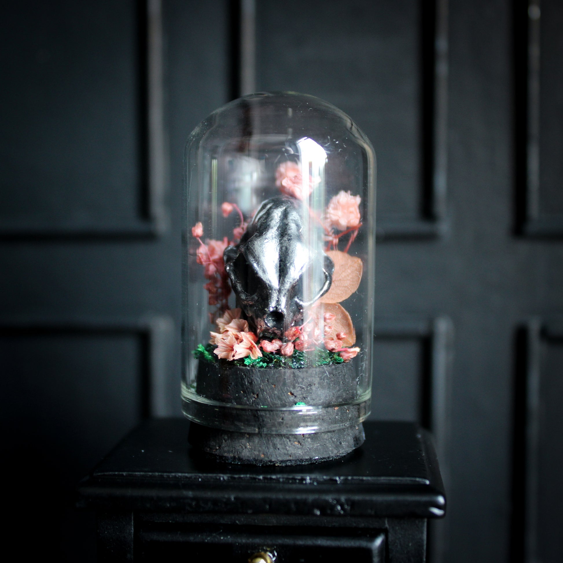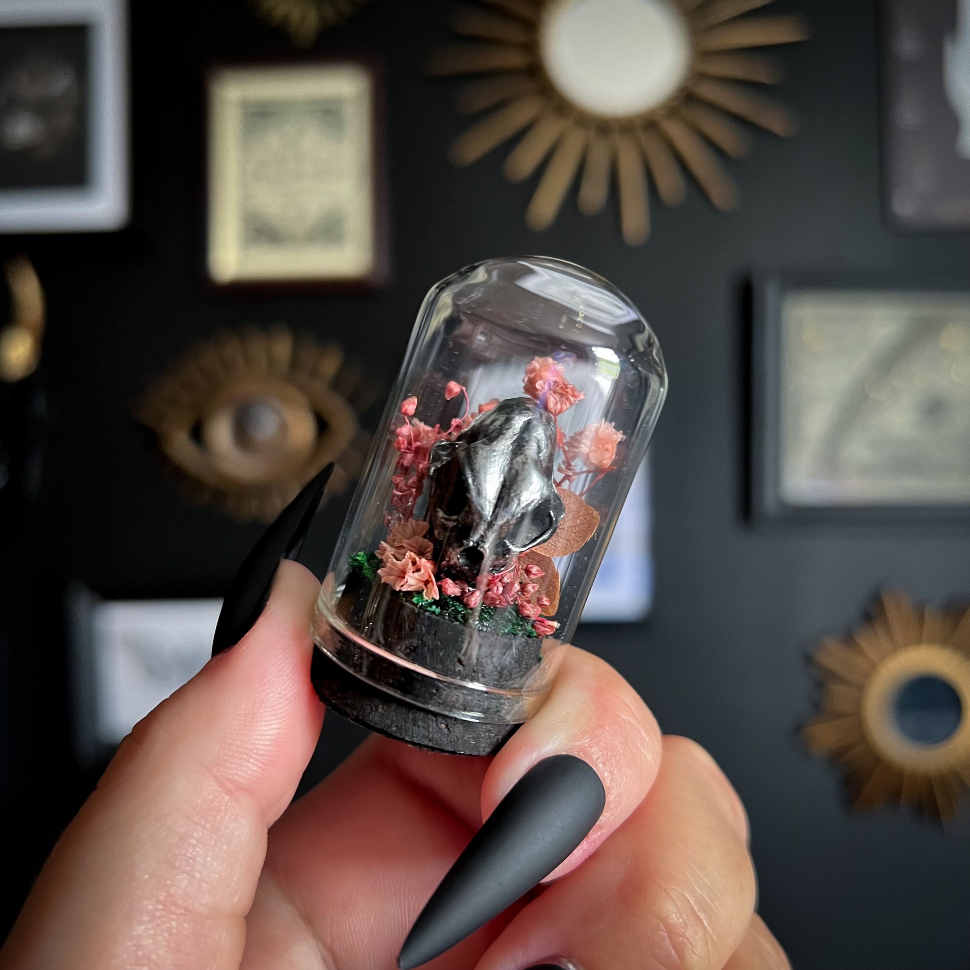 Add a touch of dark enchantment to your space with our handmade curio domes - miniature worlds captured under glass. Each dome is carefully assembled with an eerie mix of curiosities; clay skulls, faux insects & bones, real dried florals & moss, crystals and other haunted treasures.