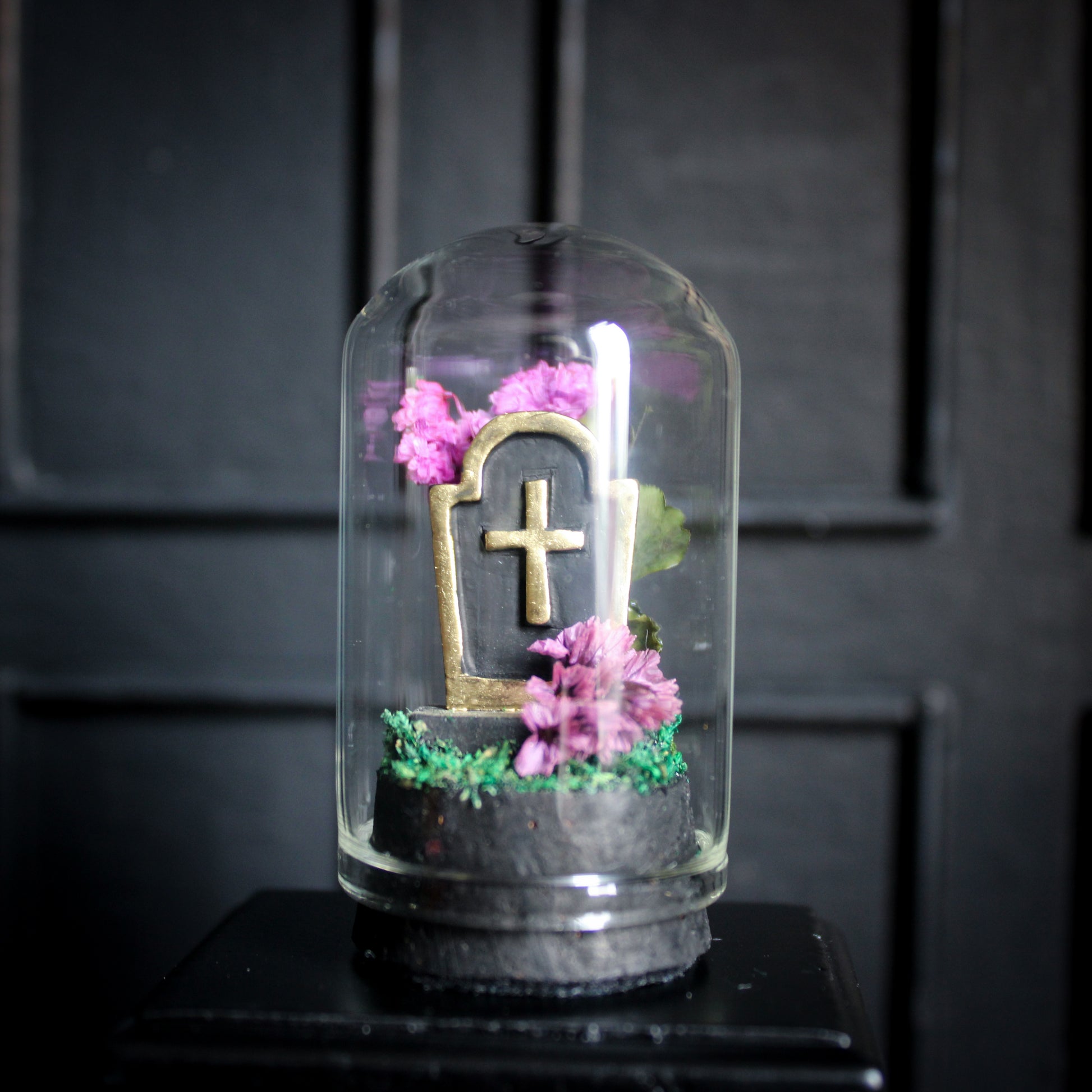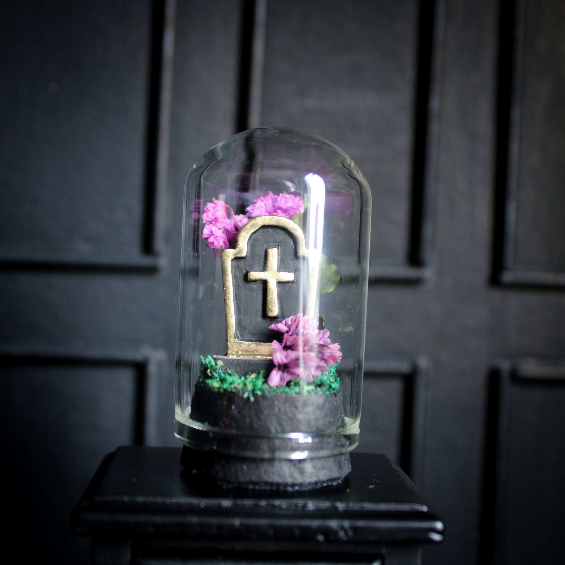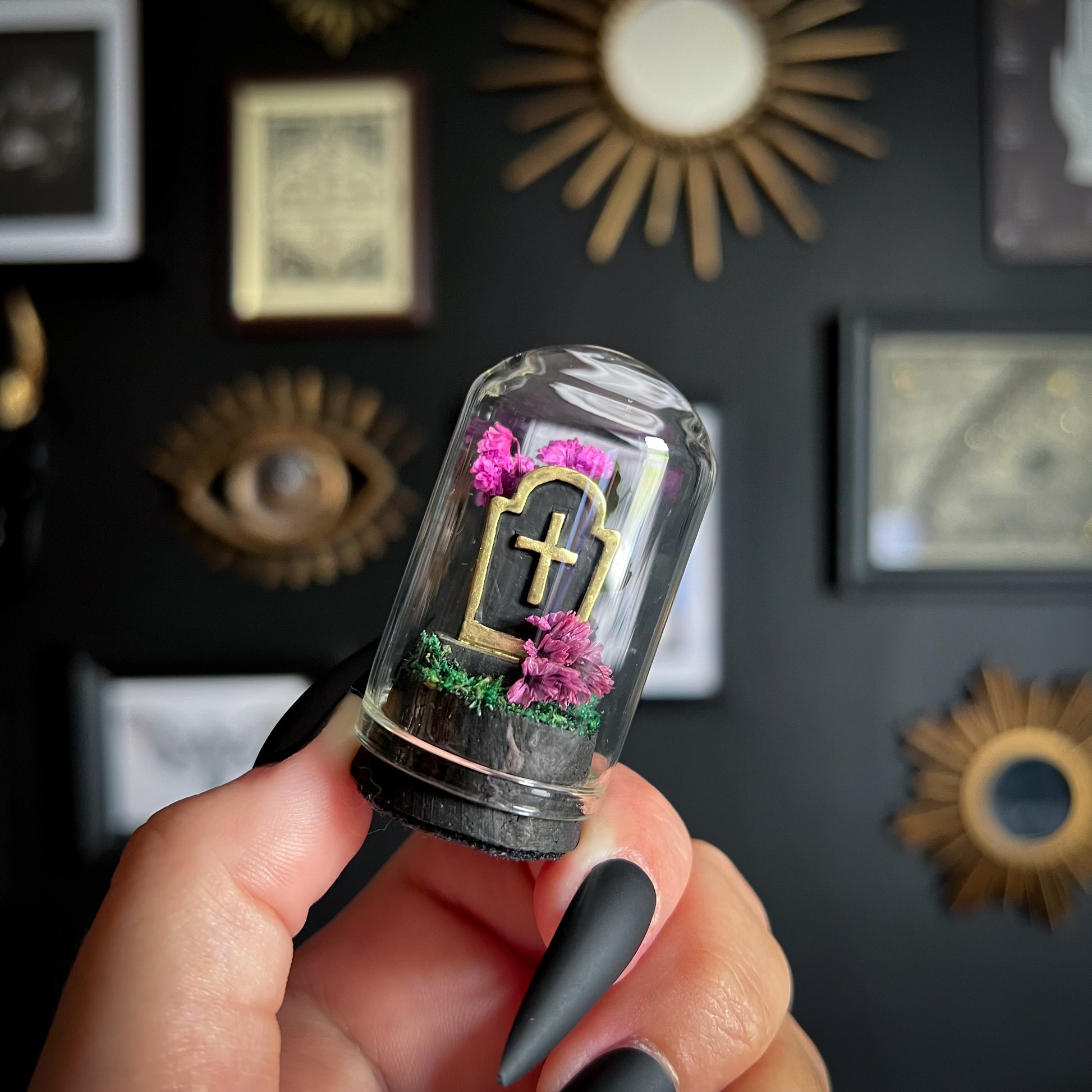 Add a touch of dark enchantment to your space with our handmade curio domes - miniature worlds captured under glass. Each dome is carefully assembled with an eerie mix of curiosities; clay skulls, faux insects & bones, real dried florals & moss, crystals and other haunted treasures.