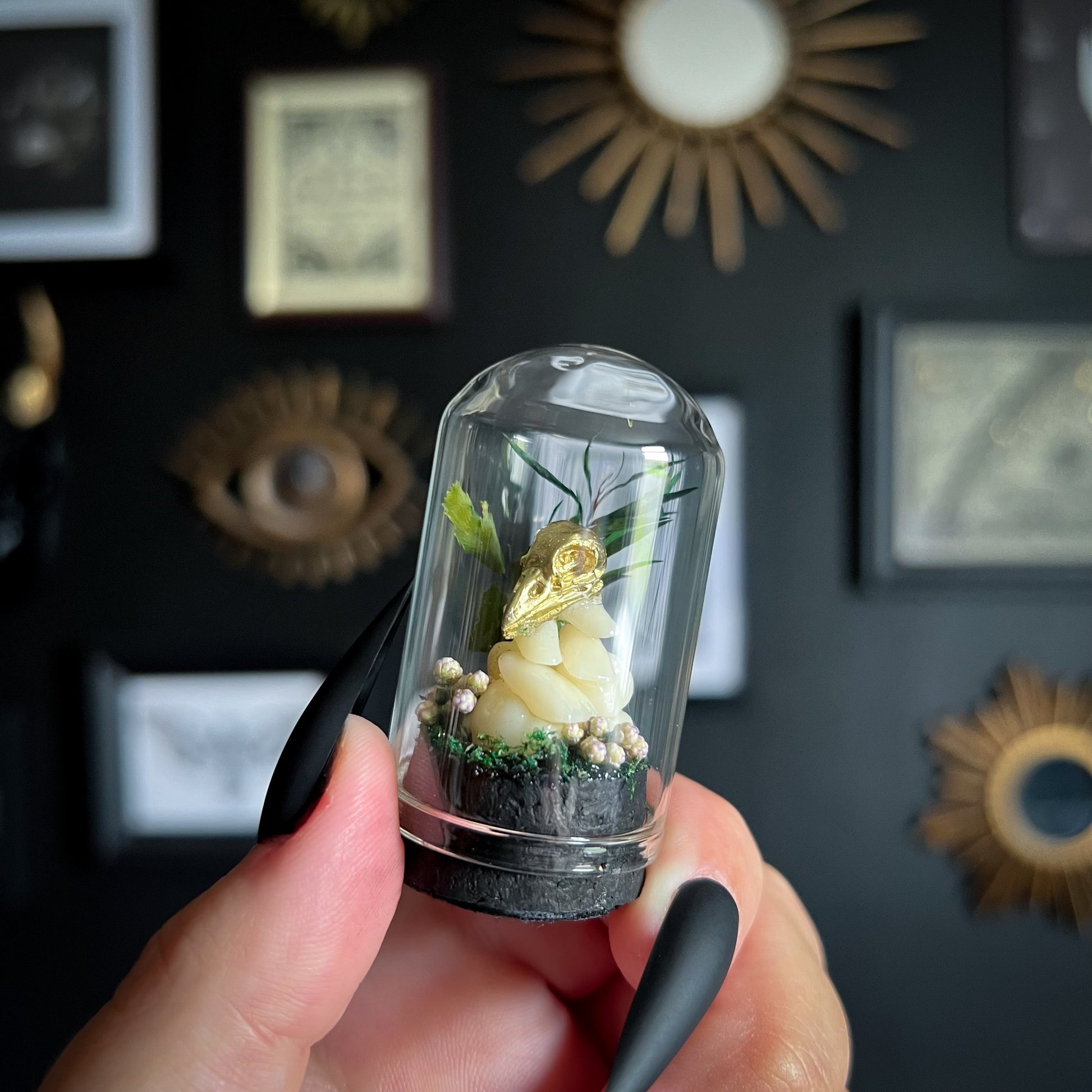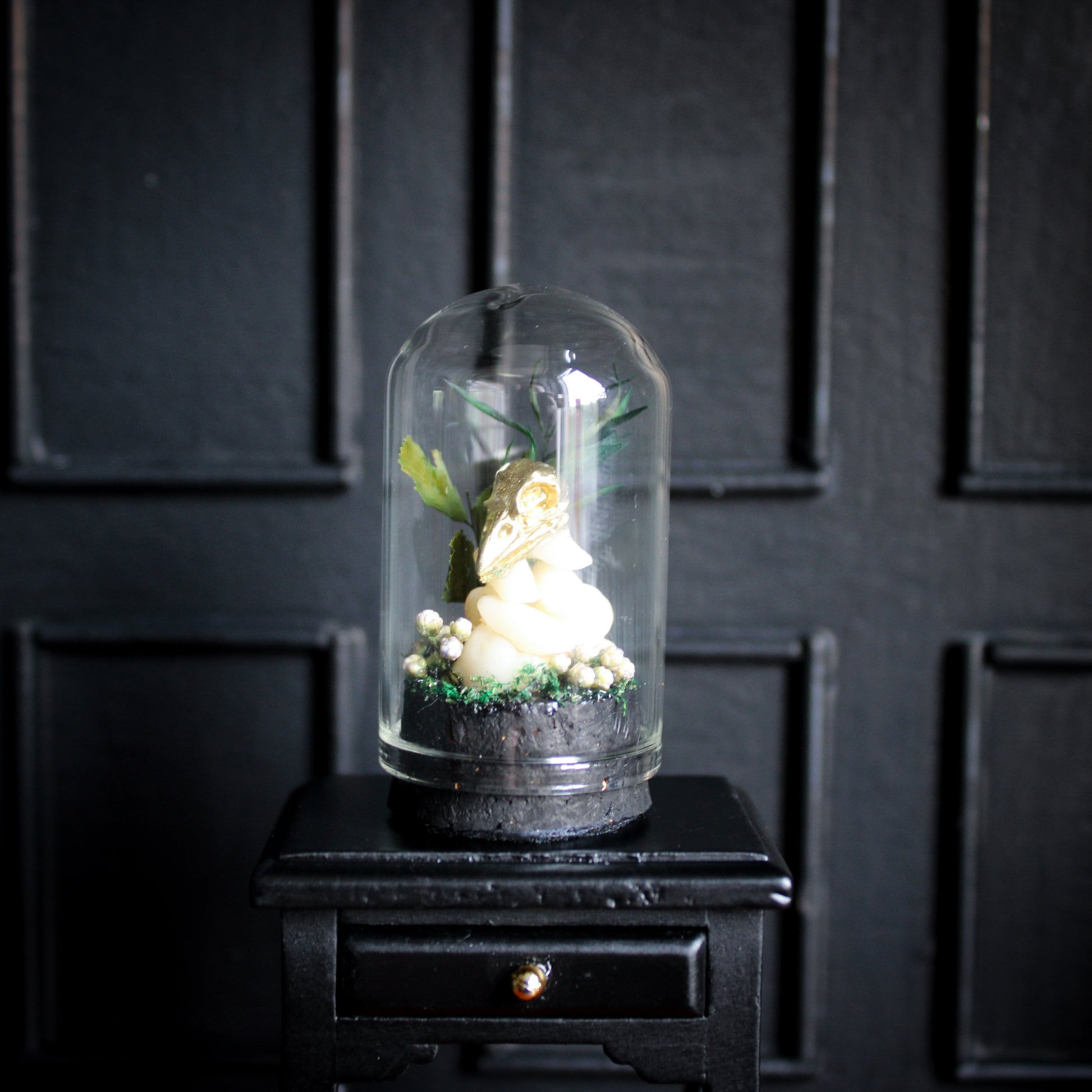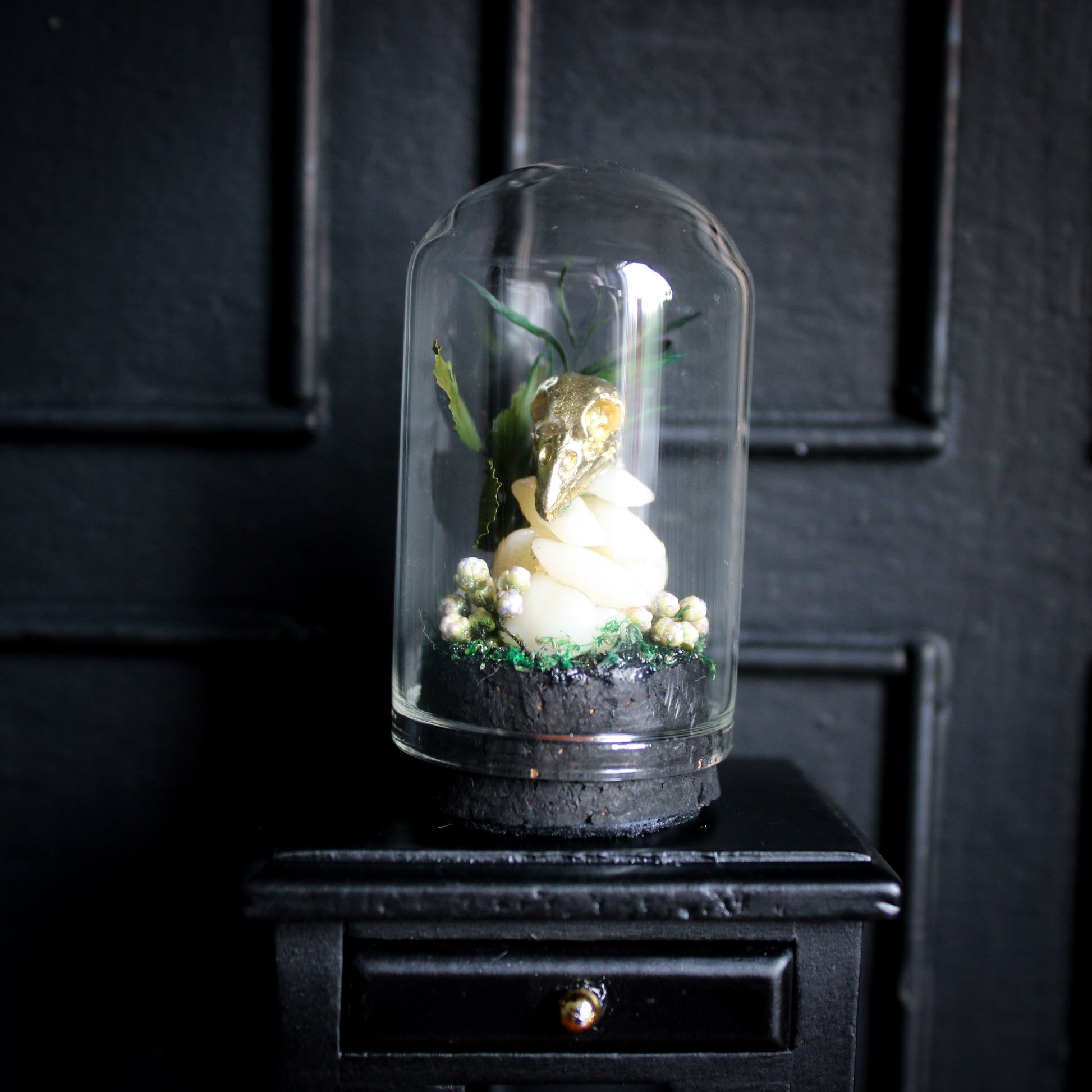 Add a touch of dark enchantment to your space with our handmade curio domes - miniature worlds captured under glass. Each dome is carefully assembled with an eerie mix of curiosities; clay skulls, faux insects & bones, real dried florals & moss, crystals and other haunted treasures.