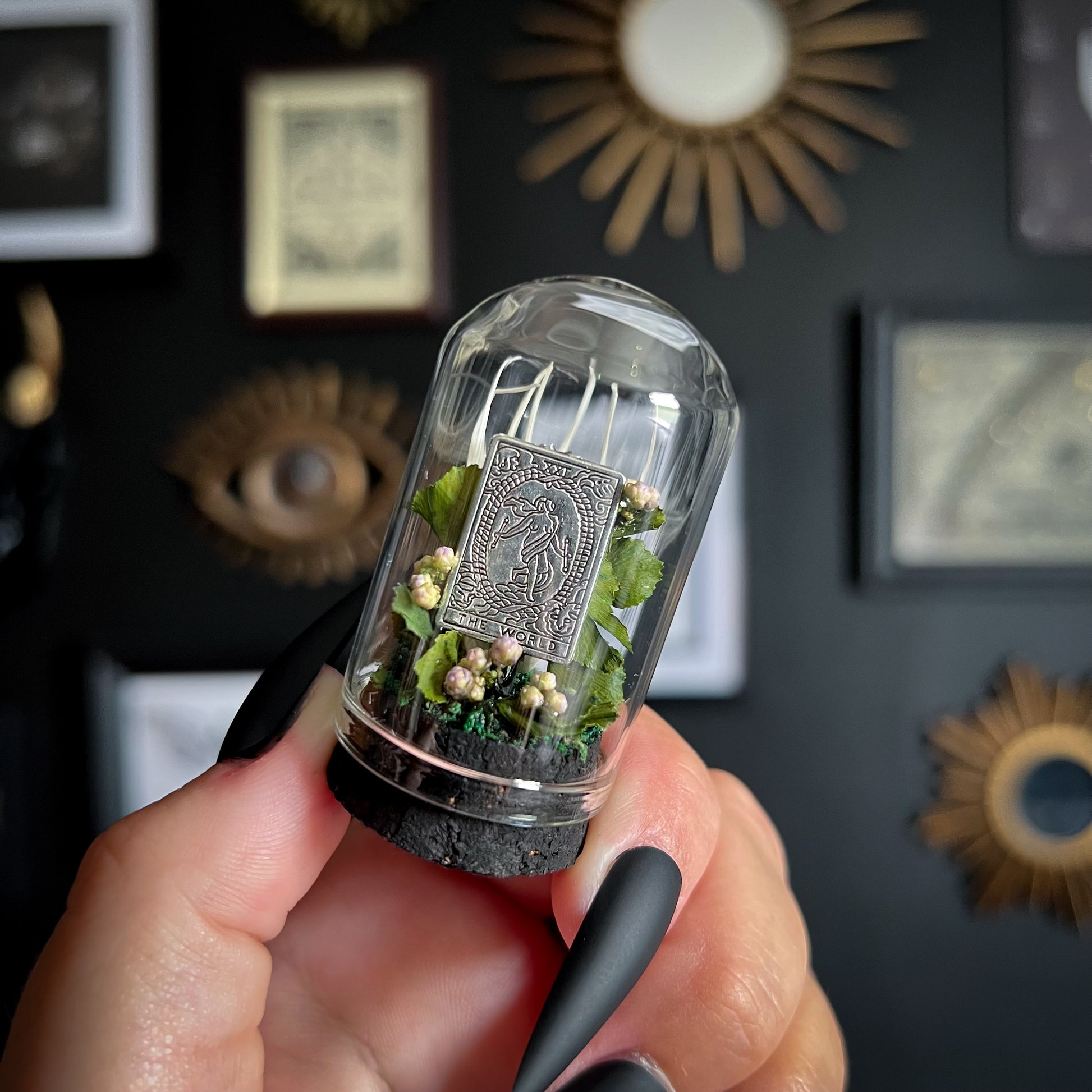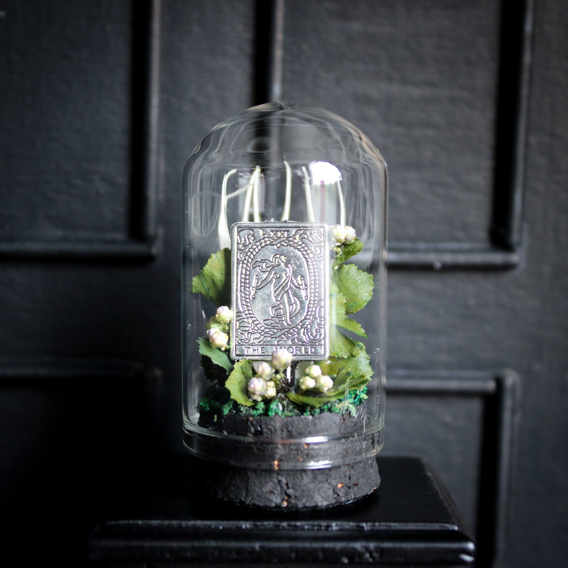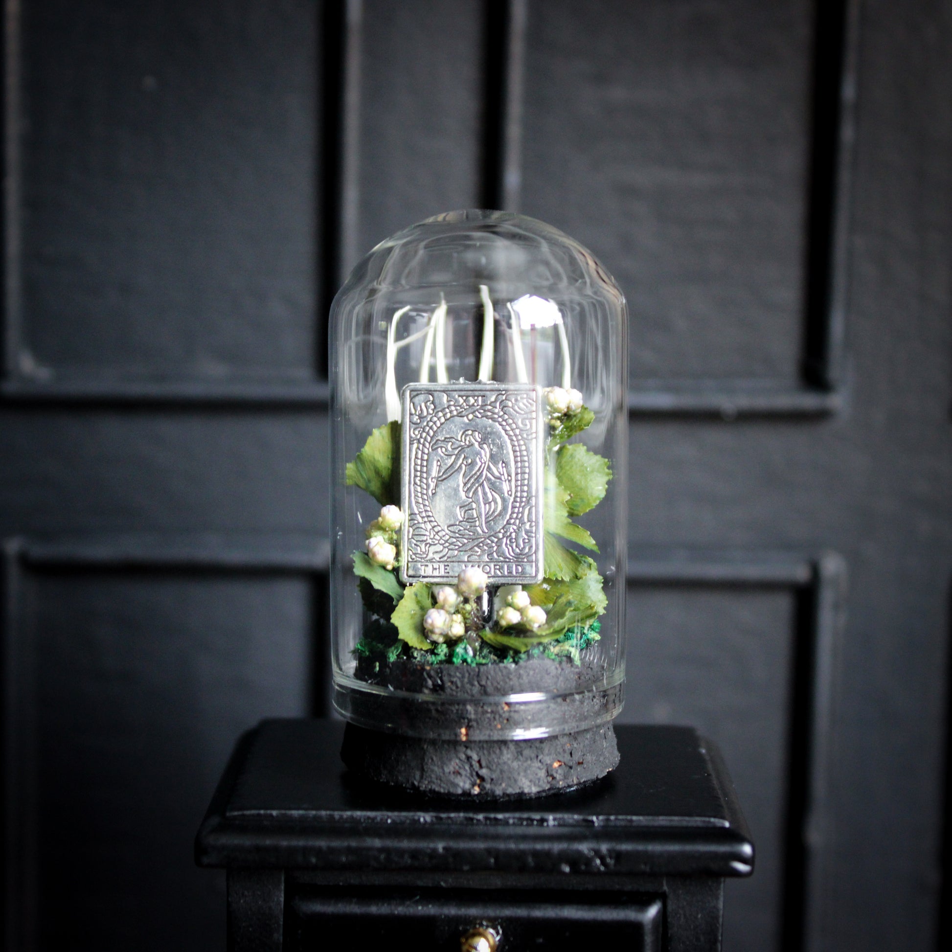 Add a touch of dark enchantment to your space with our handmade curio domes - miniature worlds captured under glass. Each dome is carefully assembled with an eerie mix of curiosities; clay skulls, faux insects & bones, real dried florals & moss, crystals and other haunted treasures.