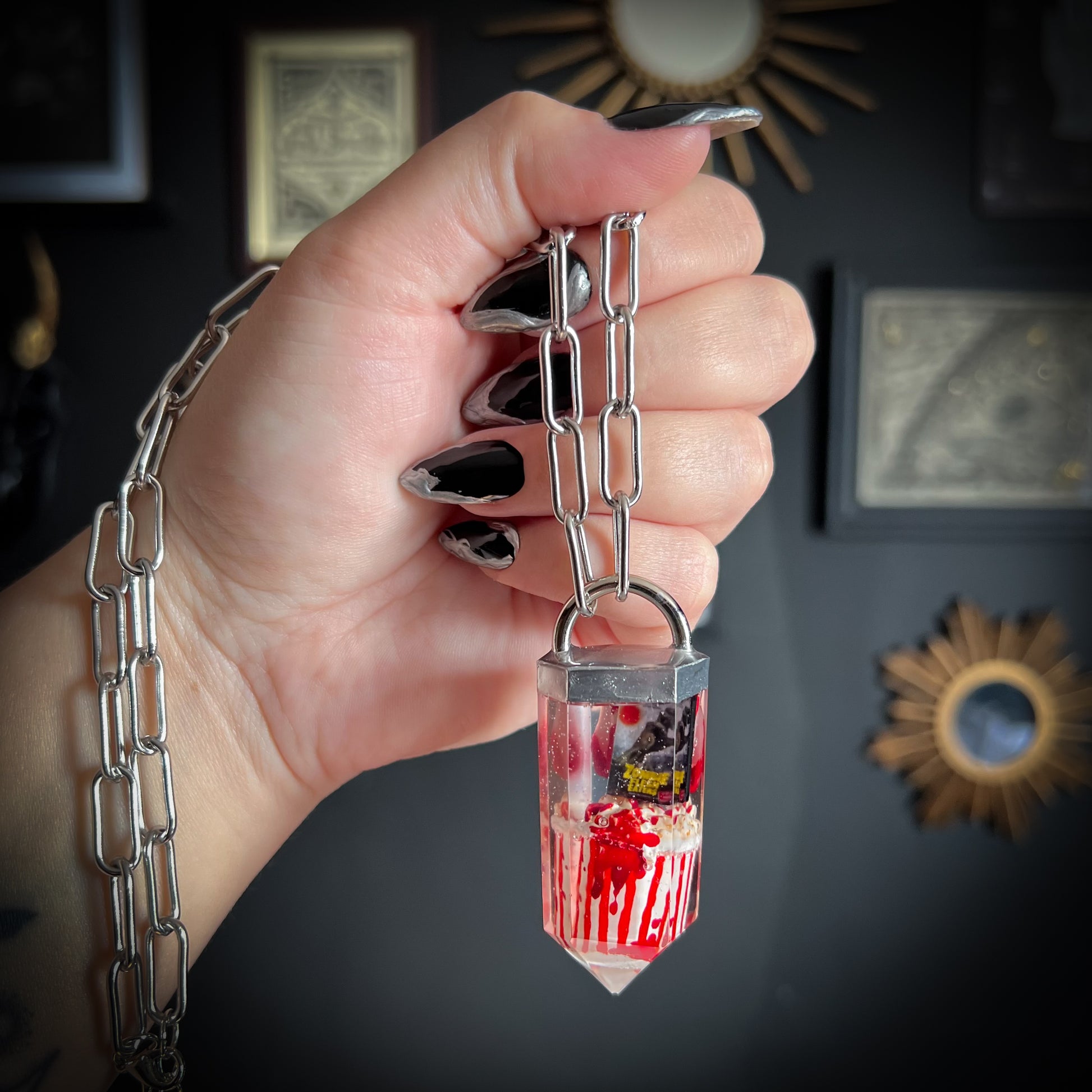 Discover the eerie elegance of our handmade crystal curio necklaces - each one a one-of-a-kind pendant encapsulating gothic charm with moths, butterflies, moss, gemstone shards, clay skulls and other tiny oddities. Darkly whimsical and beautifully macabre, these pieces are perfect for lovers of the strange, mystical and otherworldly.