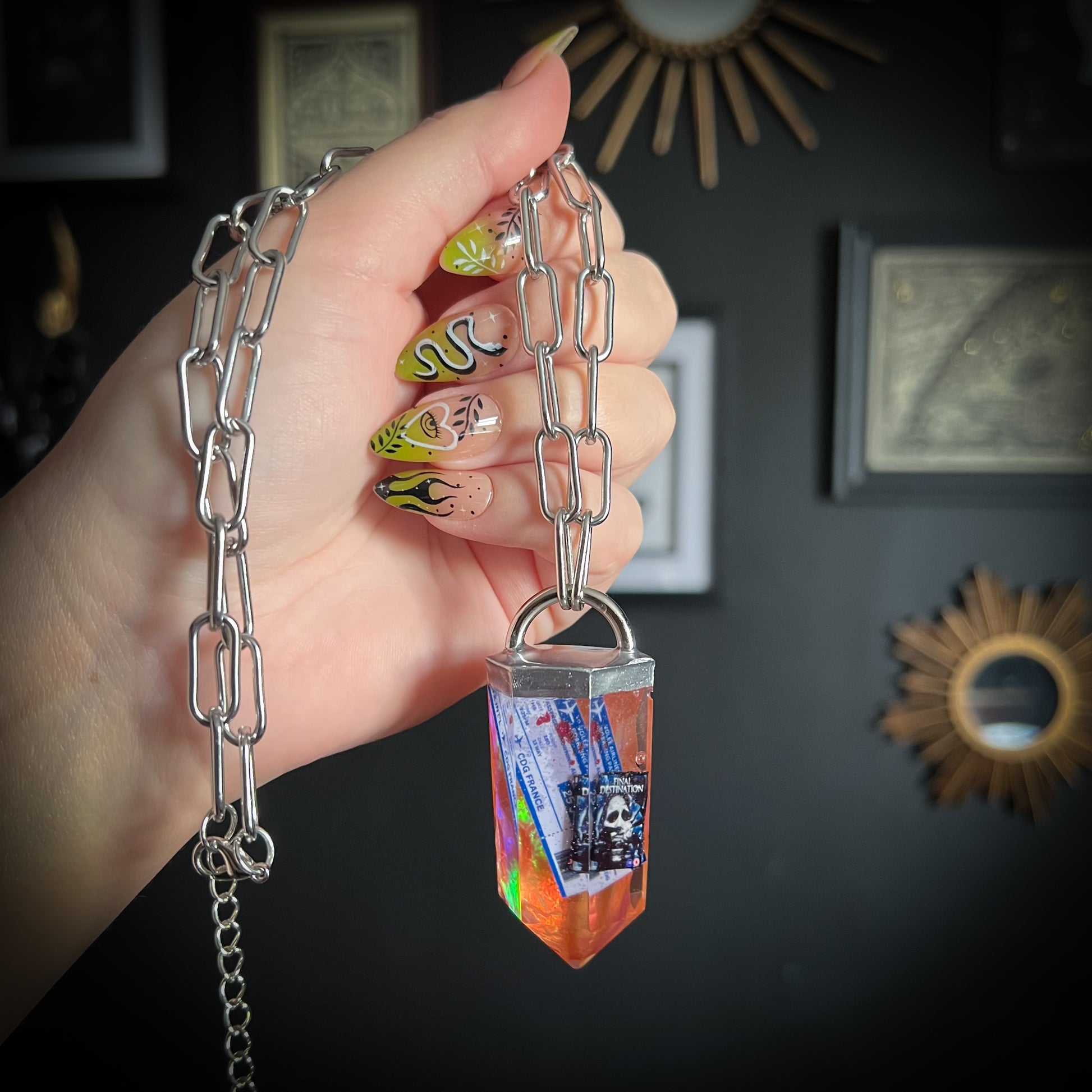 Discover the eerie elegance of our handmade crystal curio necklaces - each one a one-of-a-kind pendant encapsulating gothic charm with moths, butterflies, moss, gemstone shards, clay skulls and other tiny oddities. Darkly whimsical and beautifully macabre, these pieces are perfect for lovers of the strange, mystical and otherworldly.