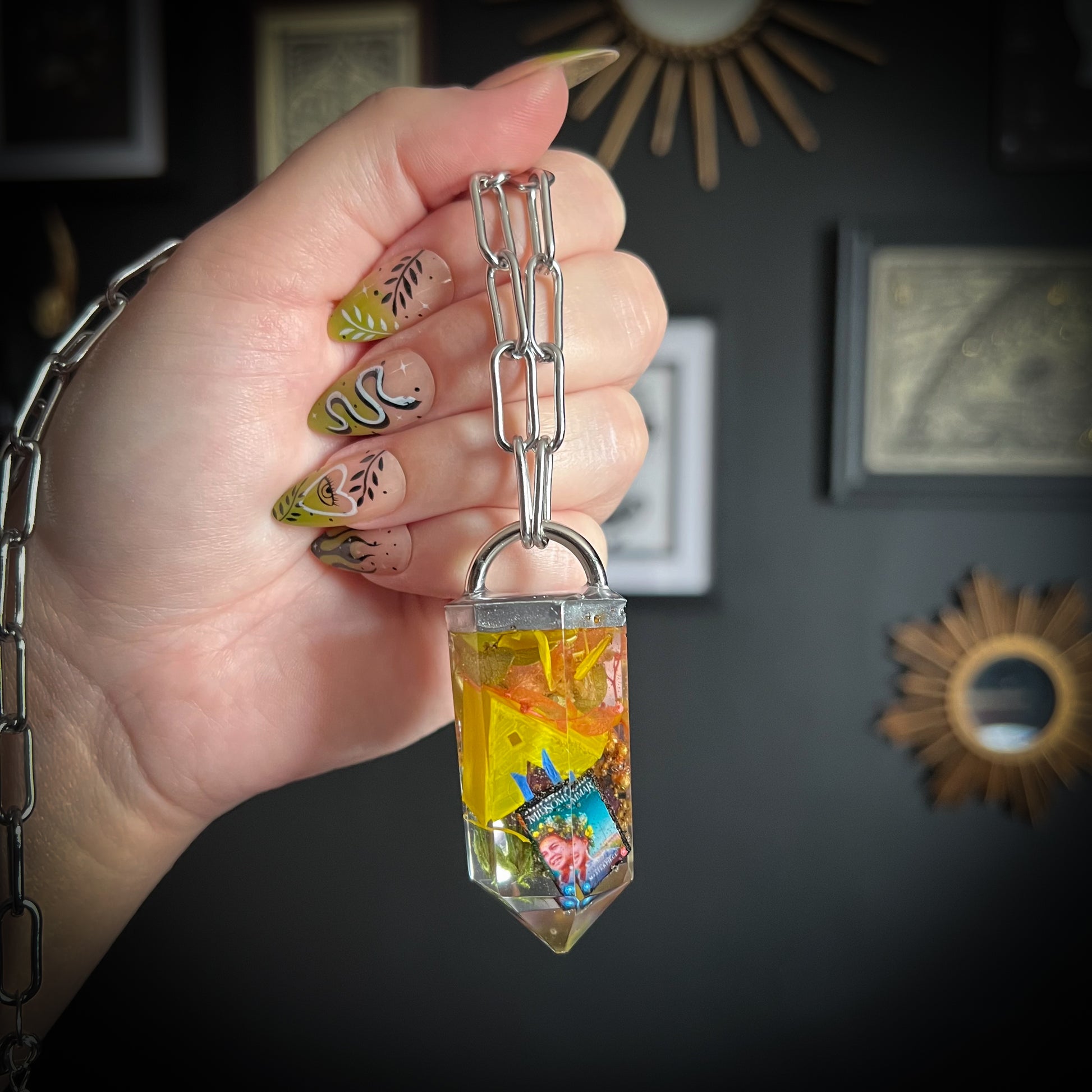 Discover the eerie elegance of our handmade crystal curio necklaces - each one a one-of-a-kind pendant encapsulating gothic charm with moths, butterflies, moss, gemstone shards, clay skulls and other tiny oddities. Darkly whimsical and beautifully macabre, these pieces are perfect for lovers of the strange, mystical and otherworldly.