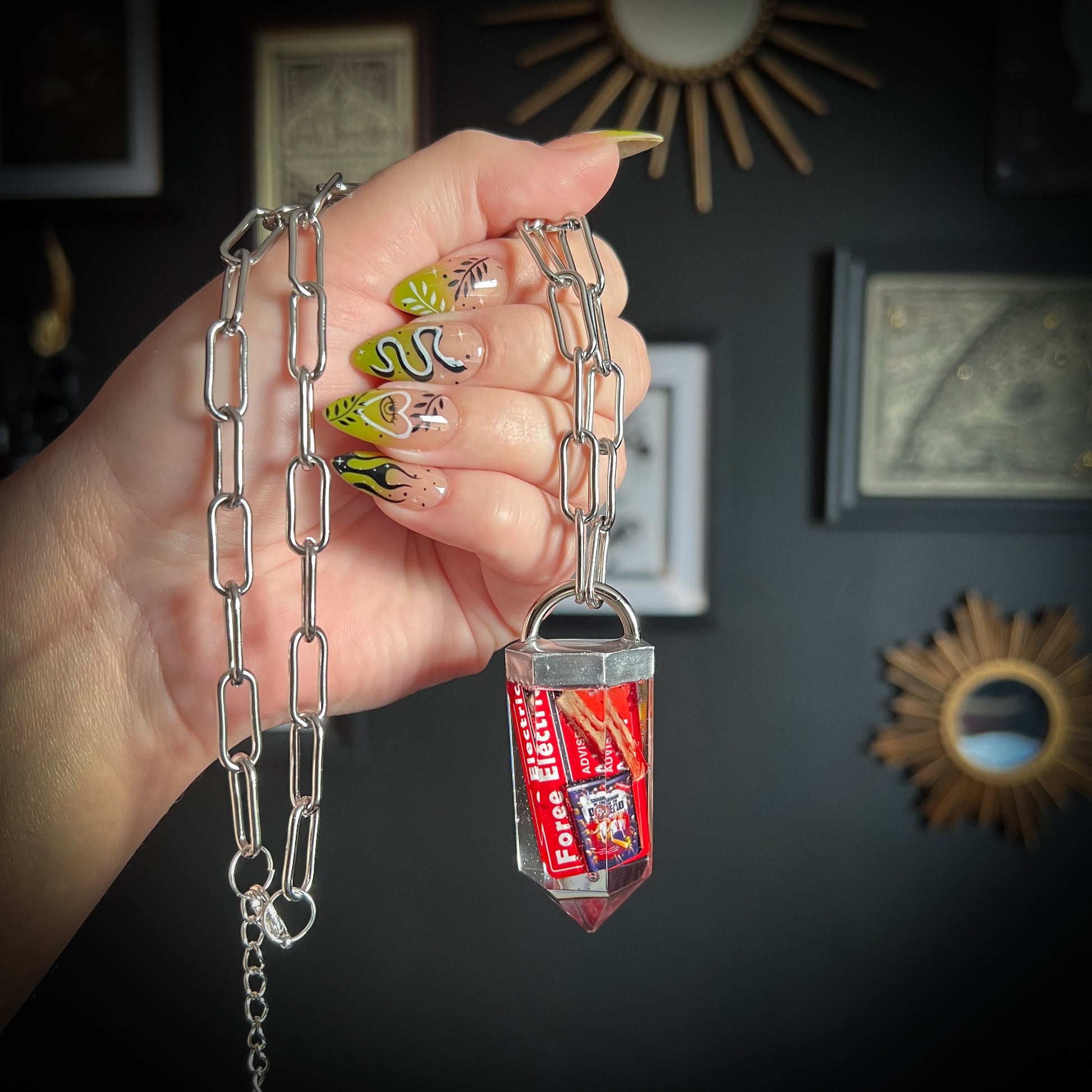 Discover the eerie elegance of our handmade crystal curio necklaces - each one a one-of-a-kind pendant encapsulating gothic charm with moths, butterflies, moss, gemstone shards, clay skulls and other tiny oddities. Darkly whimsical and beautifully macabre, these pieces are perfect for lovers of the strange, mystical and otherworldly.