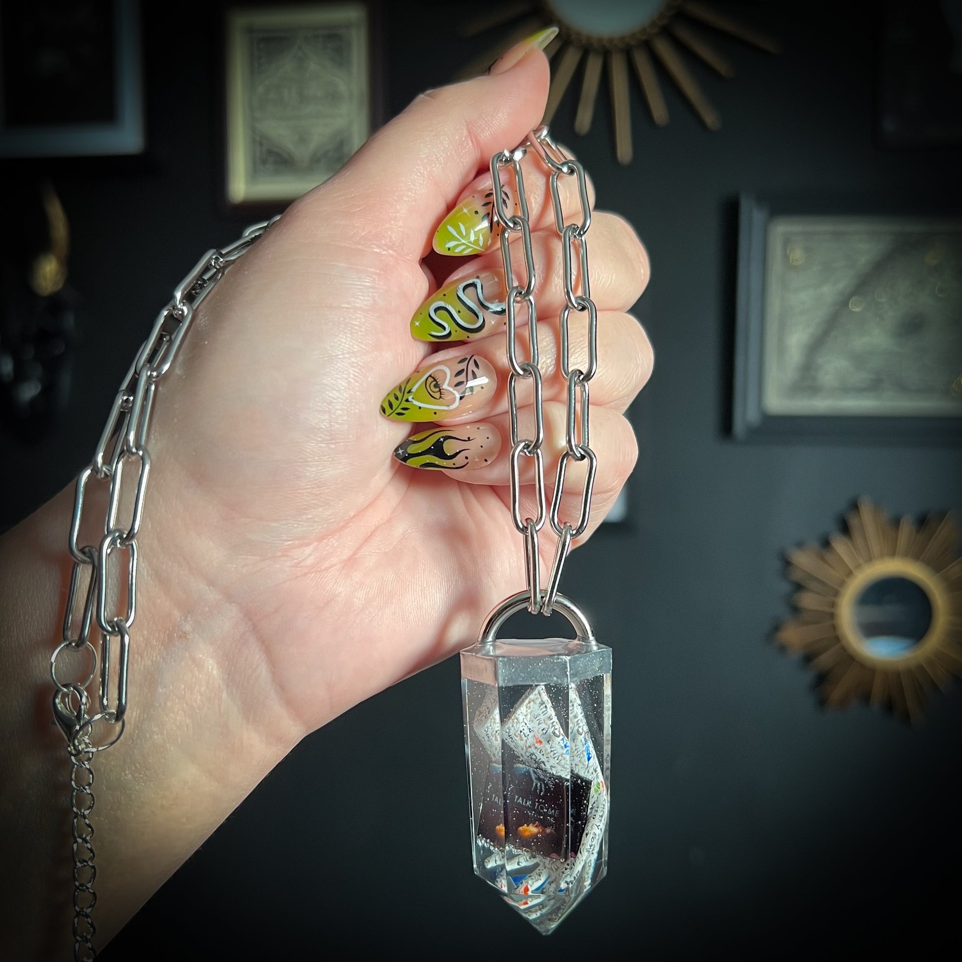 Discover the eerie elegance of our handmade crystal curio necklaces - each one a one-of-a-kind pendant encapsulating gothic charm with moths, butterflies, moss, gemstone shards, clay skulls and other tiny oddities. Darkly whimsical and beautifully macabre, these pieces are perfect for lovers of the strange, mystical and otherworldly.