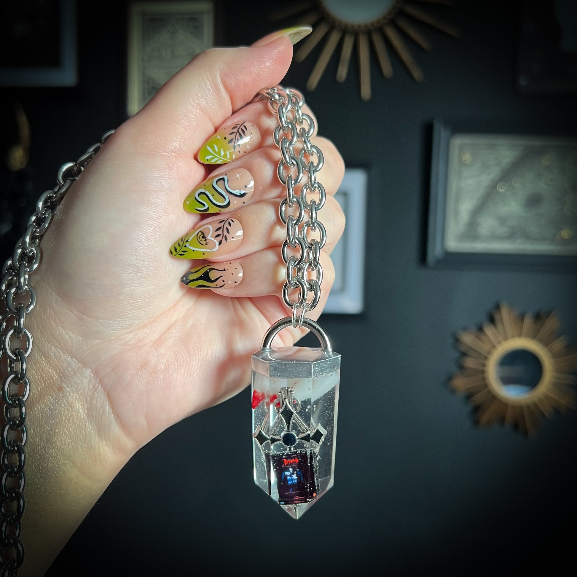 Discover the eerie elegance of our handmade crystal curio necklaces - each one a one-of-a-kind pendant encapsulating gothic charm with moths, butterflies, moss, gemstone shards, clay skulls and other tiny oddities. Darkly whimsical and beautifully macabre, these pieces are perfect for lovers of the strange, mystical and otherworldly.