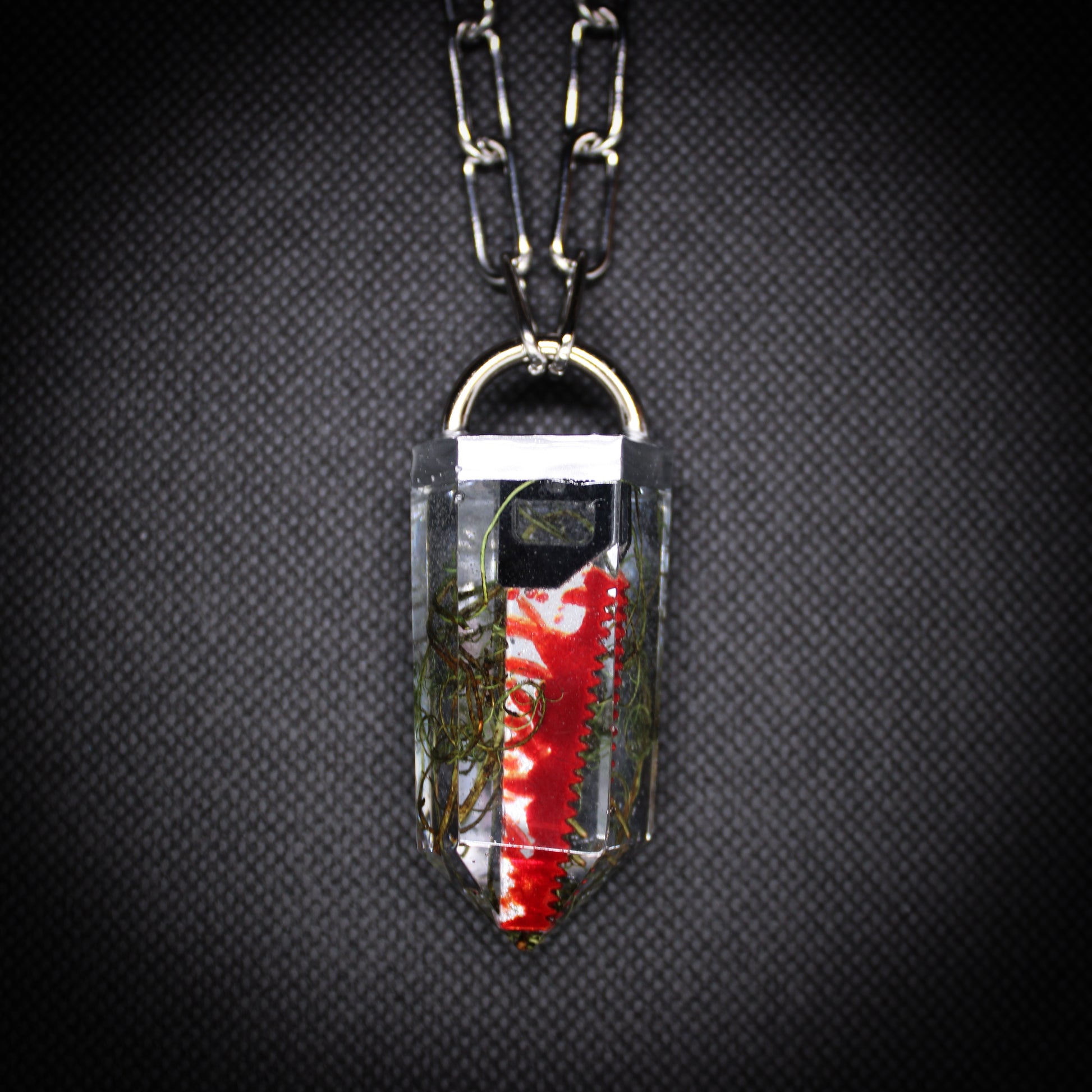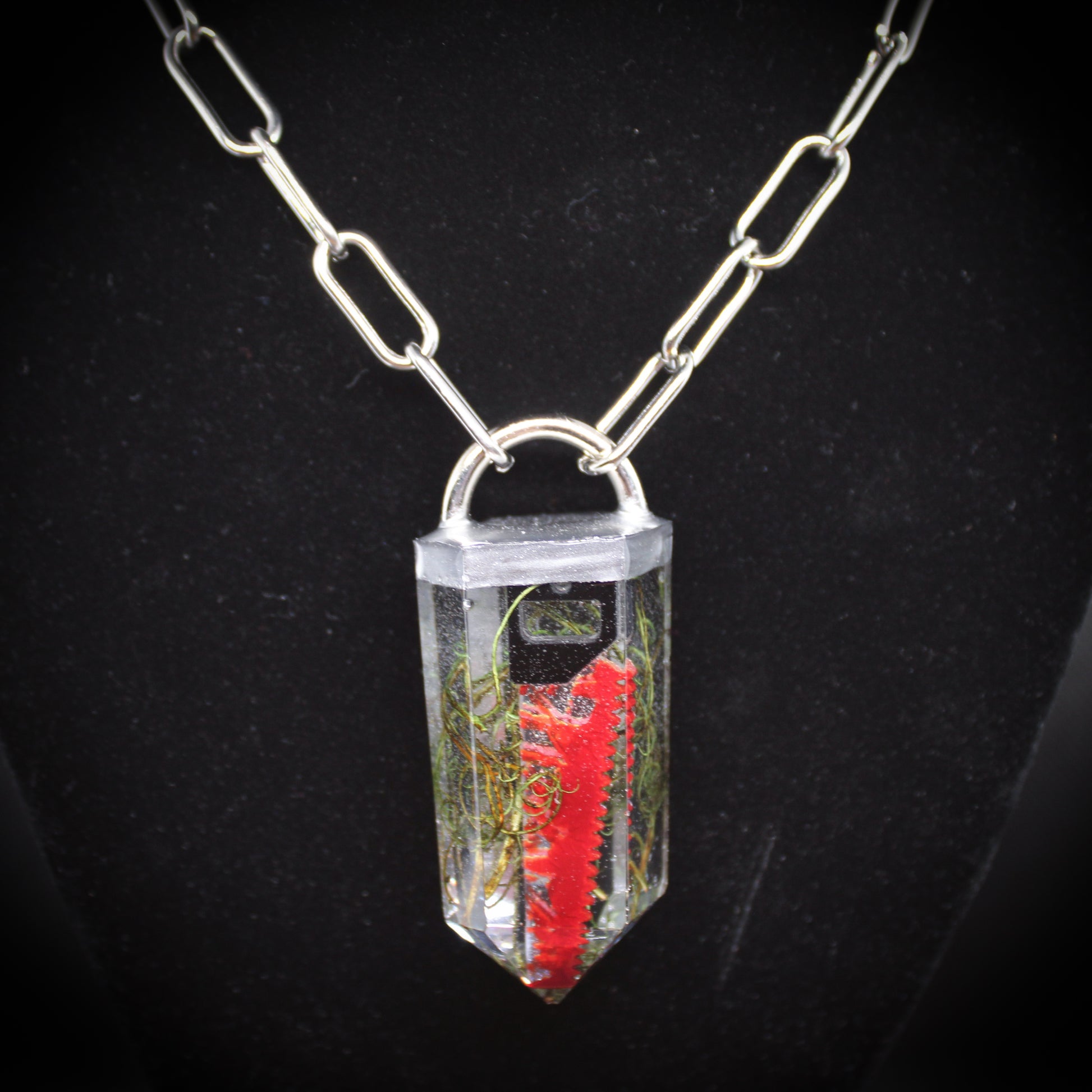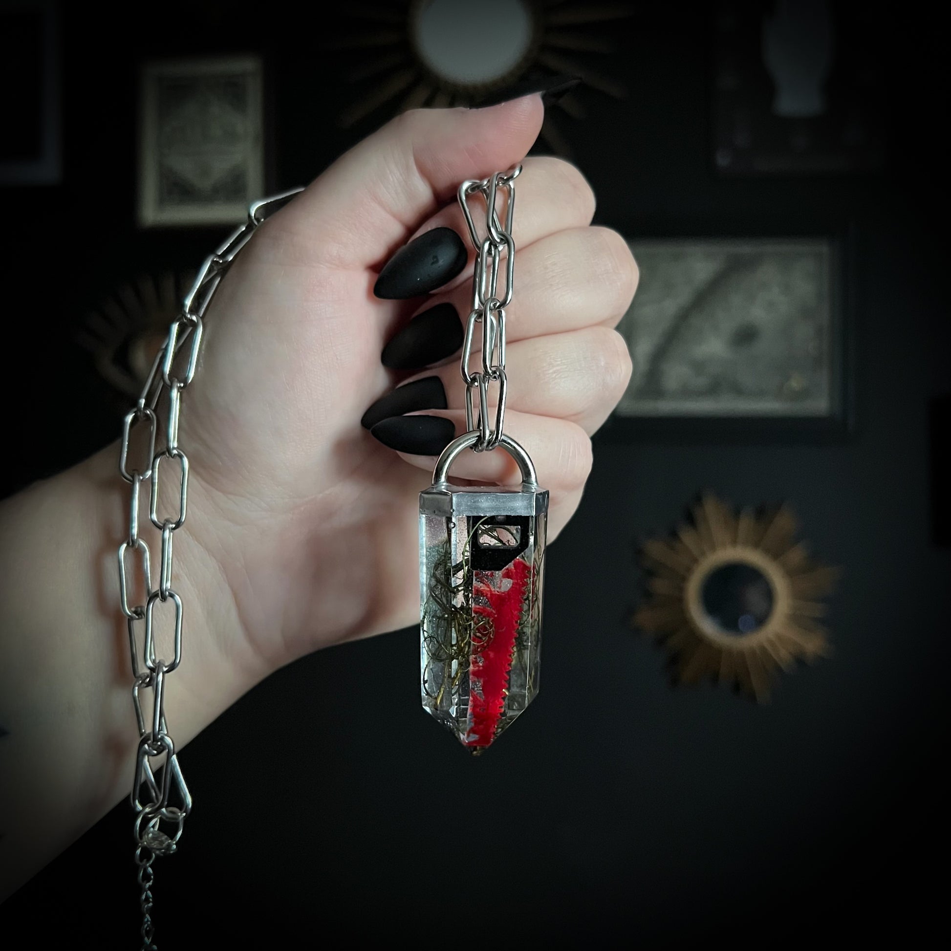 Discover the eerie elegance of our handmade crystal curio necklaces - each one a one-of-a-kind pendant encapsulating gothic charm with moths, butterflies, moss, gemstone shards, clay skulls and other tiny oddities. Darkly whimsical and beautifully macabre, these pieces are perfect for lovers of the strange, mystical and otherworldly.
